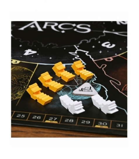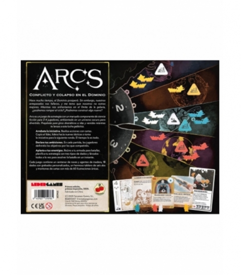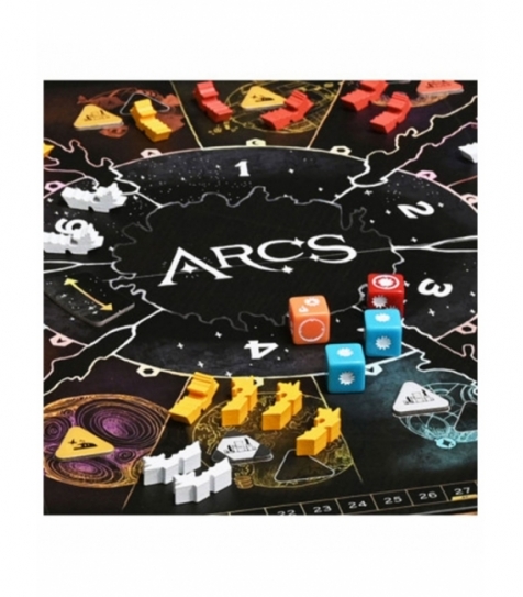 Arcs es un juego de estrategia de ciencia ficción para 2-4 jugadores, ambientado en un imperio galáctico en decadencia. Compite por el dominio mediante combates, gestión de recursos o maniobras diplomáticas. Usa cartas en bazas adyacentes para realizar acciones y declarar Ambiciones. Las batallas son rápidas y tácticas. Incluye más de 100 piezas de madera, 18 dados personalizados, tablero de seis paneles y más de 60 ilustraciones únicas. Puede jugarse en modo básico o avanzado, y es la base para la campaña con la expansión Dominio de Arcos, que añade profundidad temática y narrativa.