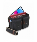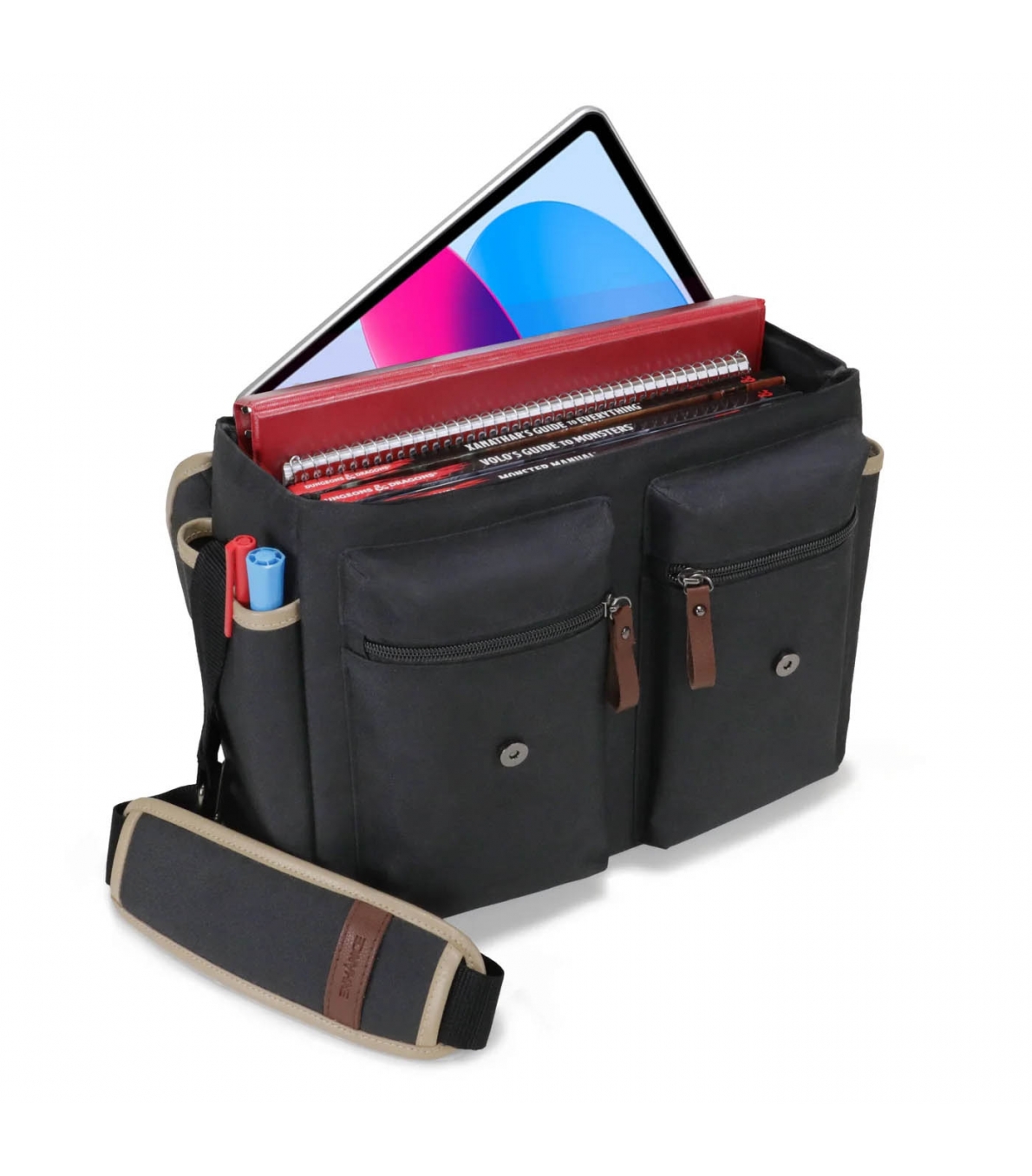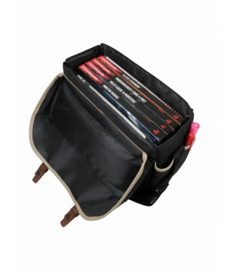 Bolso tipo messenger con detalles en piel sintética y tejido resistente, ideal para transportar libros y accesorios de rol con estilo. Capacidad para 2 a 4 manuales, archivadores o carpetas, más compartimento acolchado para tablets de hasta 12". Bolsillo oculto trasero para objetos de valor y amplios bolsillos frontales con cremallera para dados, tokens, lápices y más. Diseño funcional y elegante, perfecto para tiendas especializadas en juegos de rol y distribución de accesorios premium.