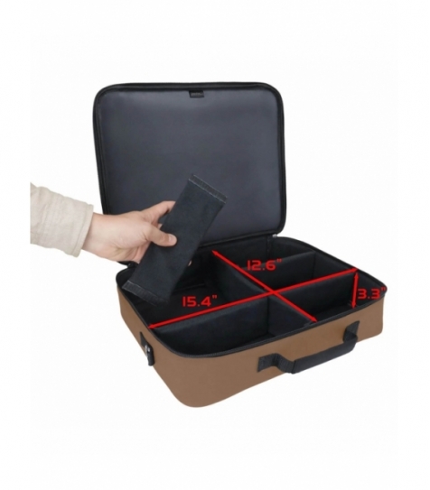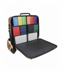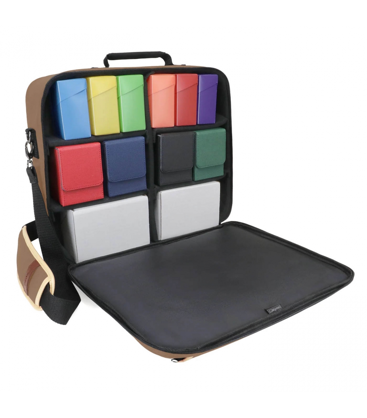 Bolsa de hombro para cartas coleccionables con interior personalizable mediante divisores ajustables. Compatible con deck boxes, cajas de cartón, dados y accesorios TCG. Dimensiones interiores: 39 × 32 × 8,5 cm. Bolsillo frontal con cremallera para sobres, fundas, contadores, tapetes y más. Exterior resistente a la intemperie, con detalles en piel sintética y correa acolchada para transporte cómodo. Ideal para tiendas y distribuidores especializados en Magic: The Gathering, Pokémon y otros JCC.