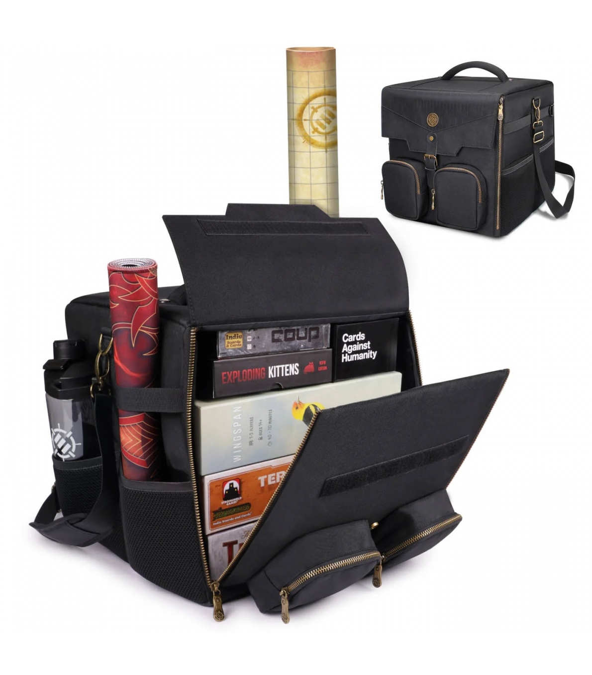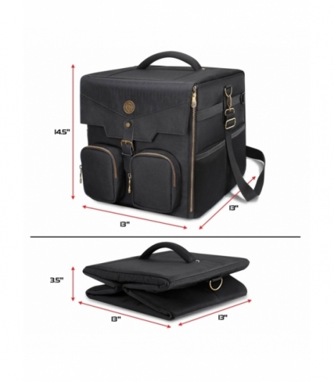 Bolsa de hombro con capacidad para almacenar una noche completa de juegos. Interior de 32 × 32 × 32 cm con paredes acolchadas y refuerzo interno semirrígido, soporta hasta 10 kg de carga. Diseño plegable que ahorra espacio cuando no está en uso. Incluye bolsillos frontales con cremallera para accesorios y juegos pequeños, más bolsillos laterales con correas ajustables para mapas, botellas o extras. Ideal para tiendas que ofrecen soluciones de transporte para juegos de mesa y rol.