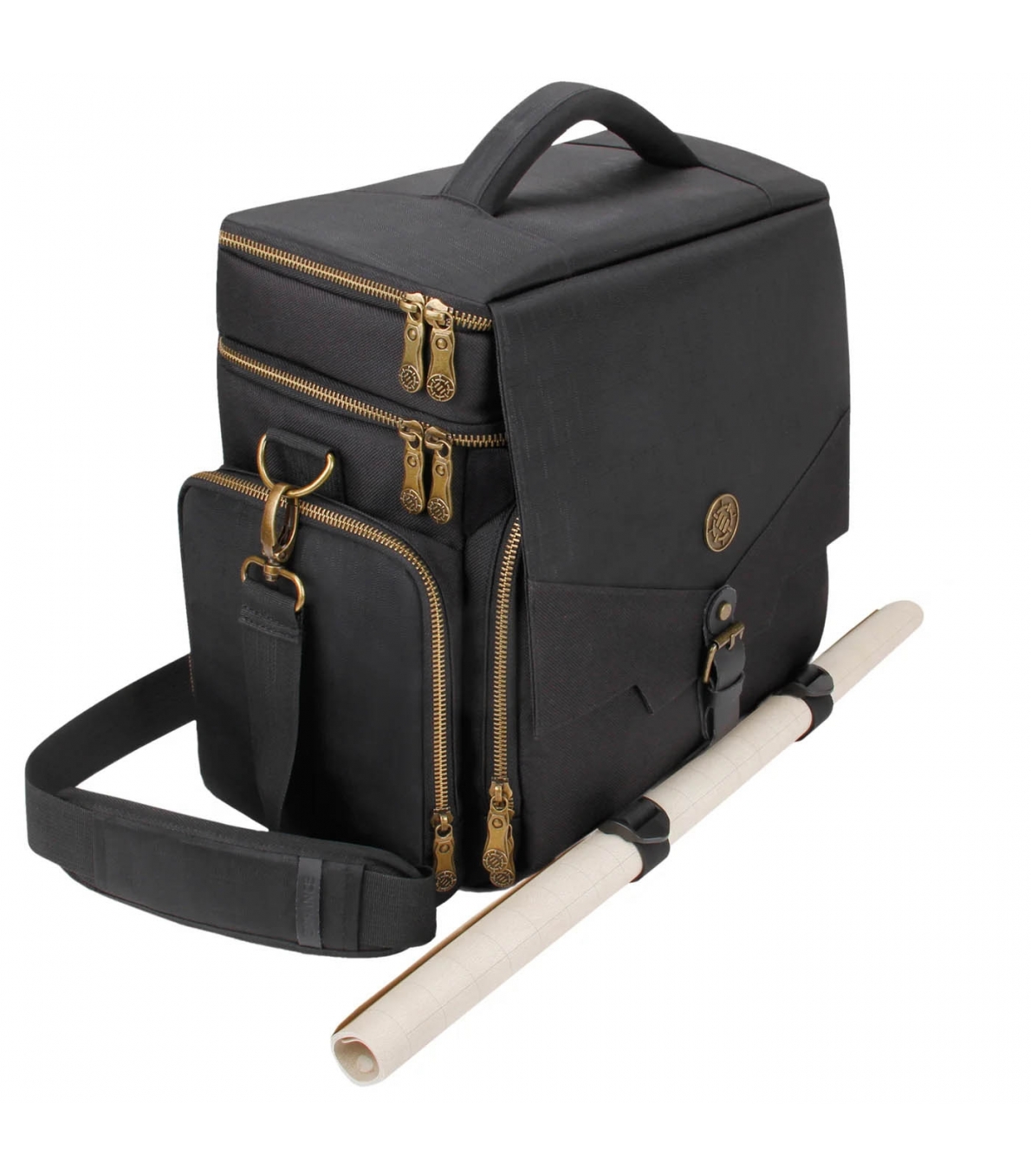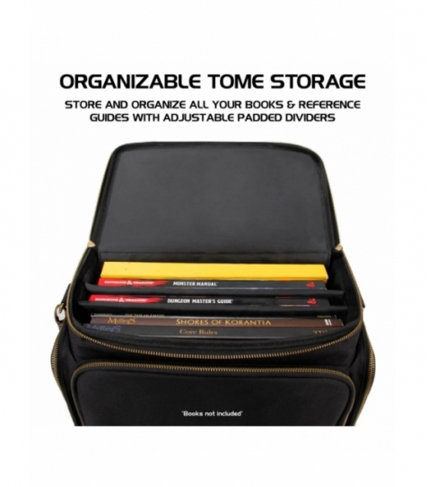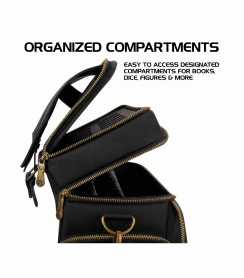 Mochila de transporte diseñada para jugadores y DMs, con capacidad para dados, miniaturas, libros, mapas y accesorios. Compartimento principal acolchado con espacio para 4 a 8 manuales y separador ajustable. Área superior con bandeja de espuma para 16 miniaturas de 28 mm. Incluye bucle externo para transportar mapas enrollados y bolsillos frontales con cremallera para dados, fichas y material de juego. Ideal para tiendas especializadas en juegos de rol y distribución mayorista.