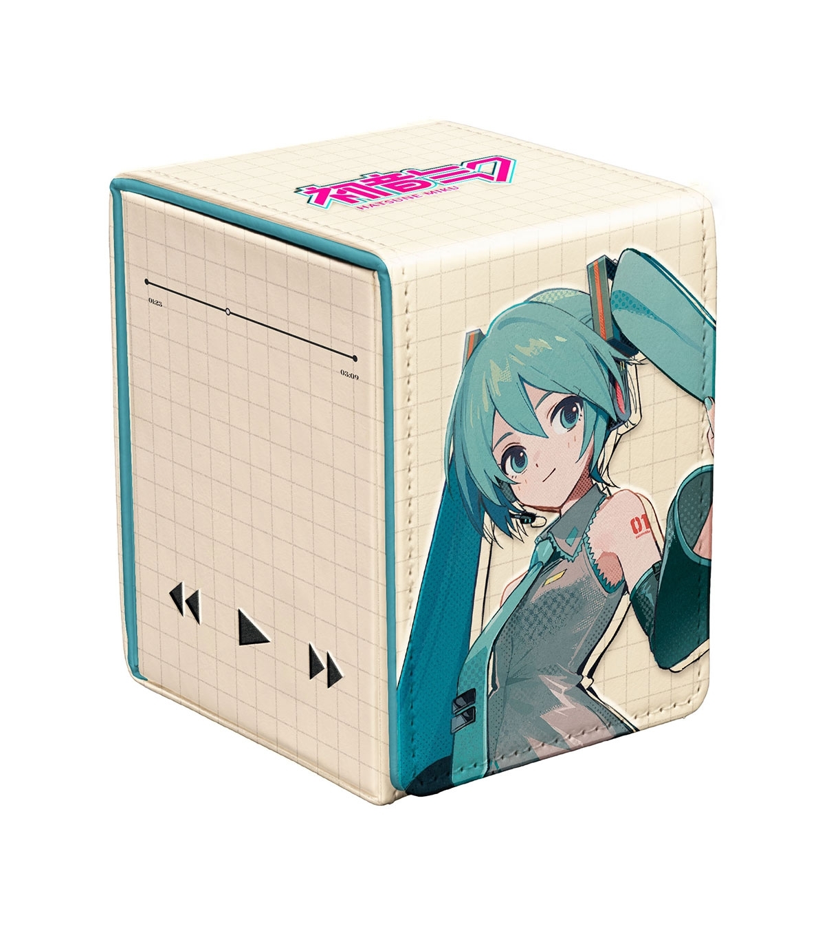 Deck Box ALCOVE® Flip 100+ - Hatsune Miku Retro Soundscapes - Ultra Pro. Caja para mazos con acabado en leatherette e ilustración vibrante a todo color de Hatsune Miku. Cuenta con cierre magnético resistente y doble muesca para facilitar la extracción del mazo. Capacidad para hasta 100 cartas tamaño estándar con doble funda en Deck Protector® de Ultra PRO. Contenedor robusto y elegante para juegos de cartas, ideal para tiendas y distribuidores especializados en TCG y merchandising oficial, con gran atractivo para coleccionistas y jugadores.