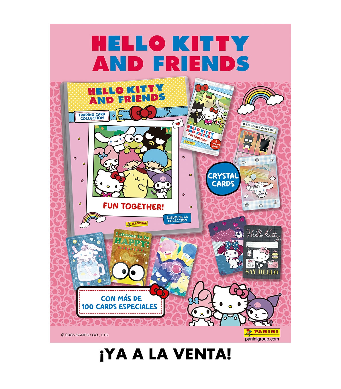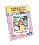Cartón promocional con archivador oficial Panini, 4 sobres de cromos Hello Kitty and Friends y 2 cards de edición limitada.