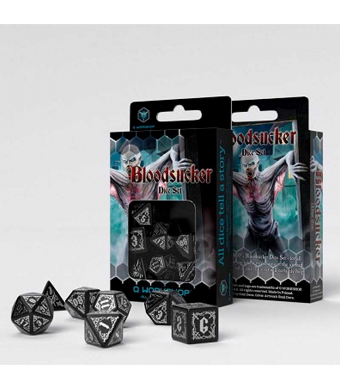 Dados Bloodsucker en Blanco y Plateado (7 unidades) - Q Workshop presenta con orgullo los excepcionales dados poliédricos Bloodsucker, ideales para héroes inmortales y cazadores de no muertos. Estos dados fueron descubiertos en lo más profundo del cajón de nuestro proyecto secreto, cubiertos de tierra de una tumba de los Cárpatos. ¡Tienen que ser tuyos!