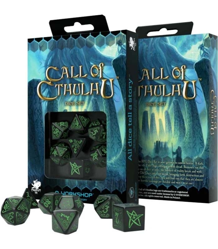 Dados Call of Cthulhu 7º edición negro y verde (7 unidades) - Q Workshop. El juego oficial de dados de la 7.ª edición de Call of Cthulhu, fabricado por Q WORKSHOP, contiene 7 dados poliédricos únicos que agregarán una atmósfera especial a tus sesiones de juego.