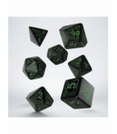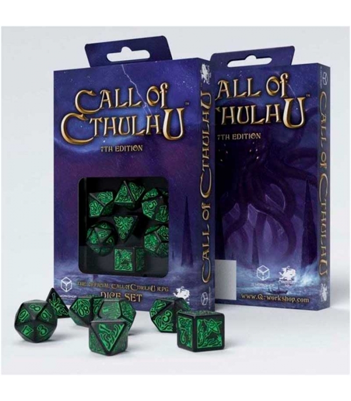 Dados Call of Cthulhu en negro y blanco (7 unidades) - Q Workshop. Imagínate nadando en un océano profundo durante la noche. El mar está frío y extrañamente tranquilo... ¡De repente, ves formas verdes inhumanas que se mueven hacia ti! Cuando crees que esos horrores marinos indescriptibles te han atrapado... te despiertas. Un juego de dados negros y verdes está sobre tu mesa... y estás seguro de que no estaban allí cuando te quedaste dormido...