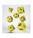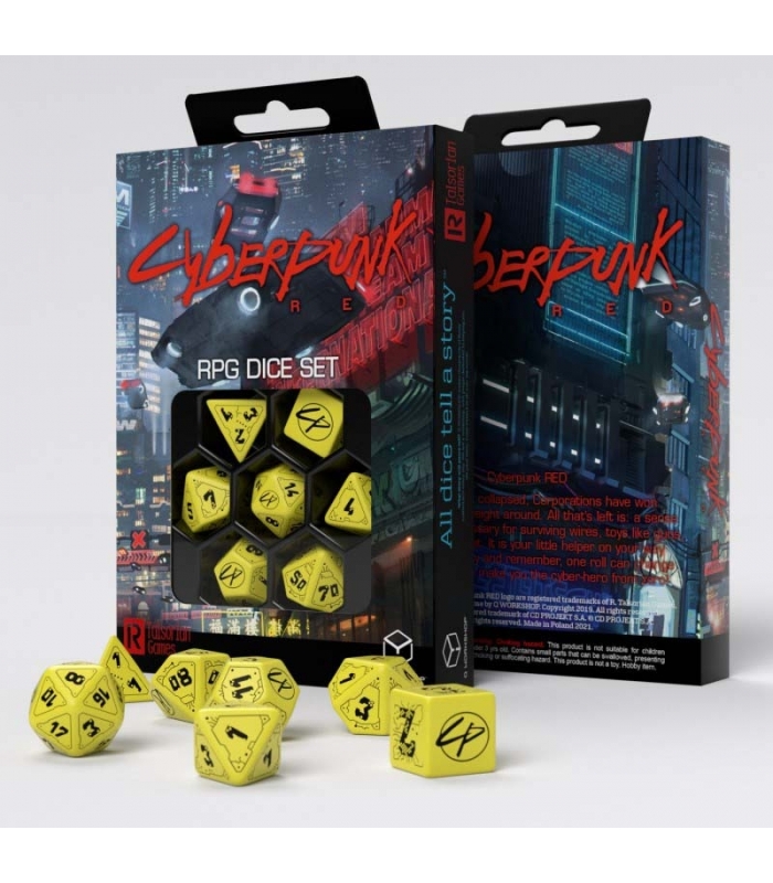 Dados Cyberpunk Red Danger Zone (7 unidades) - Q Workshop. Domina sobre los escombros. Tras la 4ª Guerra de Corporaciones, solo queda el estilo, el cable imprescindible para seguir adelante, los cyberdecks, las armas... y este set de dados. Sus siete poliedros siguen el estilo de Cyberpunk Red, con circuitos que rodean y conectan los números. El color es vibrante: grabados negros sobre un fondo amarillo.