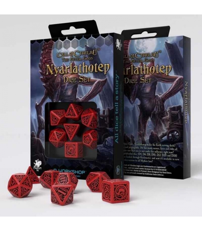 Dados de los dioses Nyarlathotep (7 unidades) - Call Of Cthulhu - Q Workshop. Nyarlathotep, el mensajero de los Dioses, camina por la Tierra para servirles. Su mayor arma es el engaño, y su influencia se extiende por todo el mundo a través de numerosos nombres, rostros y cultos. Este exclusivo juego de dados poliédricos, originalmente financiado en Kickstarter, está ahora disponible en una nueva versión a color para todos los entusiastas del universo de Mythos.