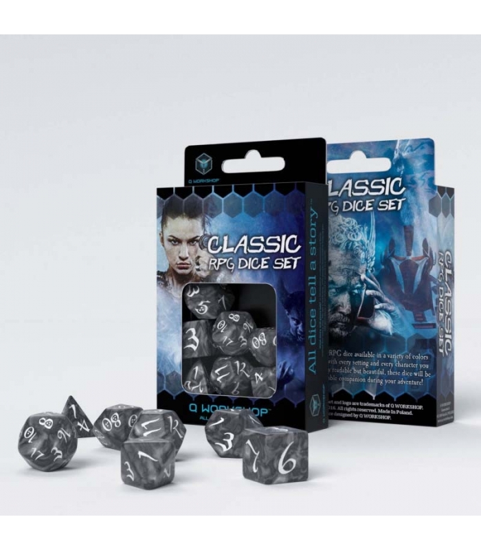 Dados de rol Clásico en ahumado y blanco (7 unidades) - Q Workshop. Gracias a nuestra nueva tecnología, podemos producir dados innovadores para juegos de rol clásicos, adecuados tanto para principiantes como para veteranos, a un precio asequible para cualquier jugador. Los dados están grabados con una fuente élfica, simple pero hermosa, que los hace más legibles que nunca.