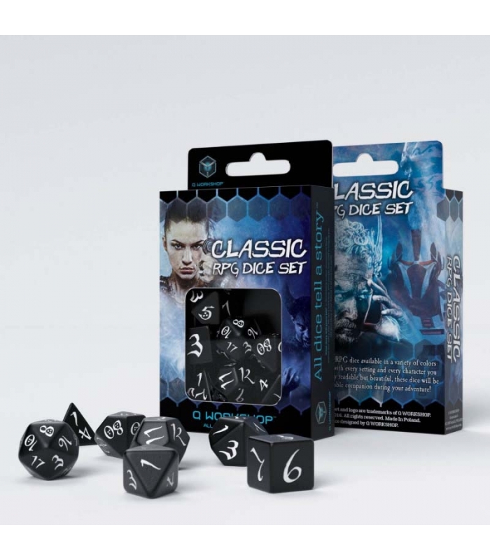 Dados de rol Clásico en negro y blanco (7 unidades) - Q Workshop. Gracias a nuestra nueva tecnología, podemos producir dados para juegos de rol clásicos, tanto para principiantes como para veteranos, a un precio accesible para todos los aficionados. Los dados están elaborados con una fuente élfica, simple pero hermosa, que los hace fáciles de leer. Estos dados son más legibles que nunca.