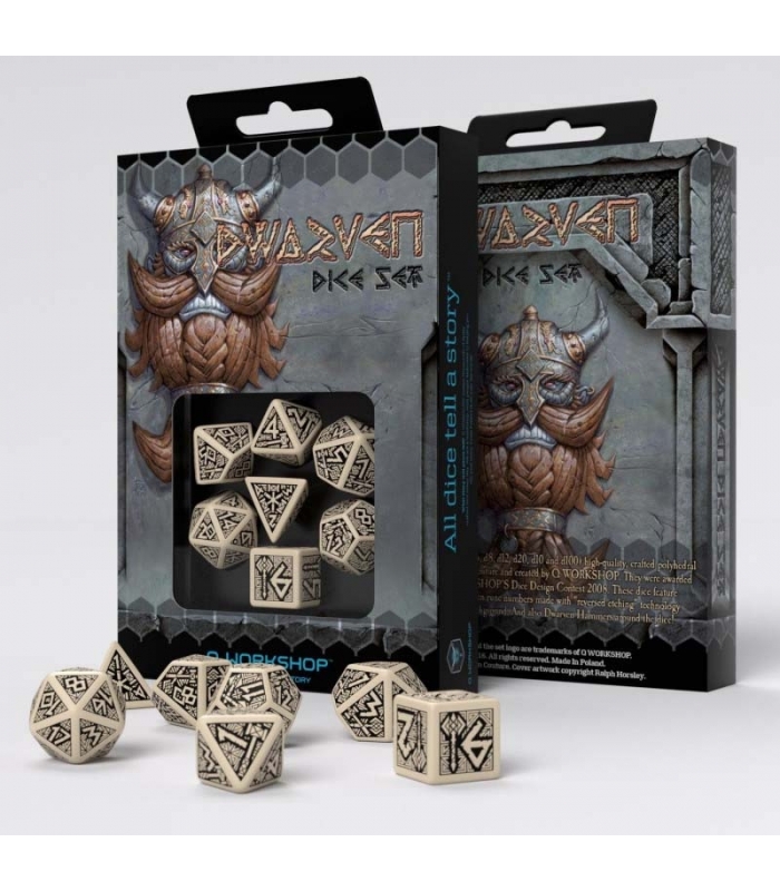 Dados Dwarven en Beige y Negro (7 unidades) - Q Workshop. Una colección de los artefactos más raros y hermosos creados por Quentin el Inventor. Han sido pulidos por un mítico herrero enano, por lo que conservan su color blanco original. Estos dados muestran intrincados detalles del estilo enano. ¡Haz que los tiren! ¡Los resultados de los dados son más sorprendentes que nunca!.