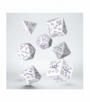 Dados Japoneses Blue Star Lotus (7 unidades) - Q Workshop. Una flor que quiere ser estrella. ¡Abre los brazos para saludar al gran regreso del diseño renovado del juego de dados de inspiración japonesa! Están hechos del mejor material, con dígitos escritos en caracteres kanji y adornados con pequeñas flores. El juego contiene 7 piezas estándar de tamaño regular, con el material blanco y la pintura en color violeta.