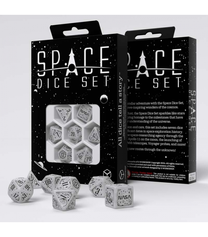 Dados Space: Apollo (7 unidades) - Q Workshop. ¡Acércate más a la luz de las estrellas! Únete a nosotros para conmemorar los logros más importantes de la historia de la humanidad. El juego de dados espaciales “Apolo” incluye 7 poliedros únicos con motivos inspirados en la exploración espacial. Los dados son blancos, cubiertos de un polvo brillante, y los grabados están en negro. Este es un regalo maravilloso para cualquier aficionado a los juegos de rol, la ciencia ficción o la astronomía.