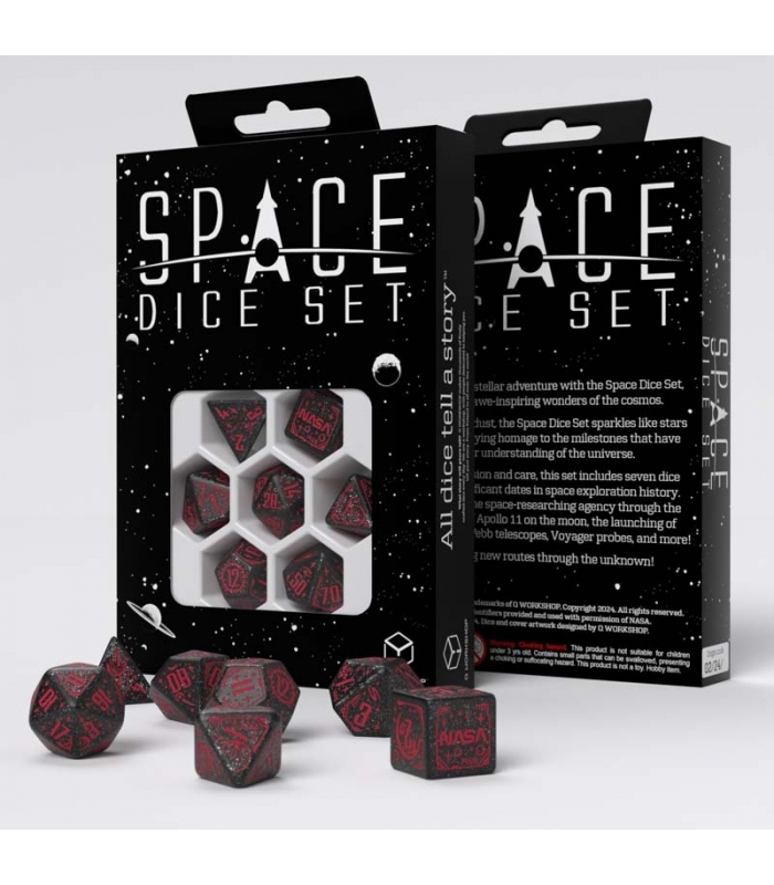Dados Space: Voyager (7 unidades) - Q Workshop. ¡Adéntrate en el espacio profundo con nosotros! Celebra los hitos más importantes de la exploración espacial con el juego de dados Voyager. Este set incluye 7 poliedros únicos, decorados con motivos espaciales. Los dados, de color negro con purpurina, tienen grabados en rojo, lo que los convierte en el regalo perfecto para fanáticos de los viajes cósmicos y los juegos de rol.