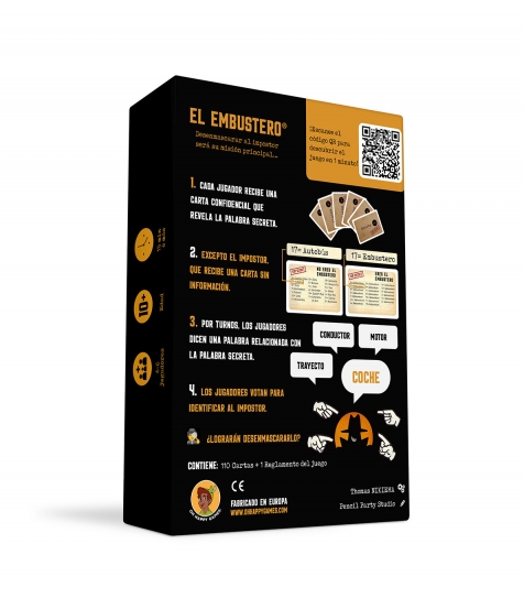 El Embustero es un juego social de palabras con más de 1 millón de jugadores en todo el mundo y miles de partidas en España. En este juego de creatividad y engaño, todo el mundo sabe la palabra secreta excepto uno. Cada turno añade tensión: pistas demasiado obvias ayudan al Embustero; pistas demasiado vagas te ponen en el punto de mira. Ideal para familias, grupos de amigos y fiestas. Partidas rápidas, formato compacto y altísima rejugabilidad. Información del producto:
