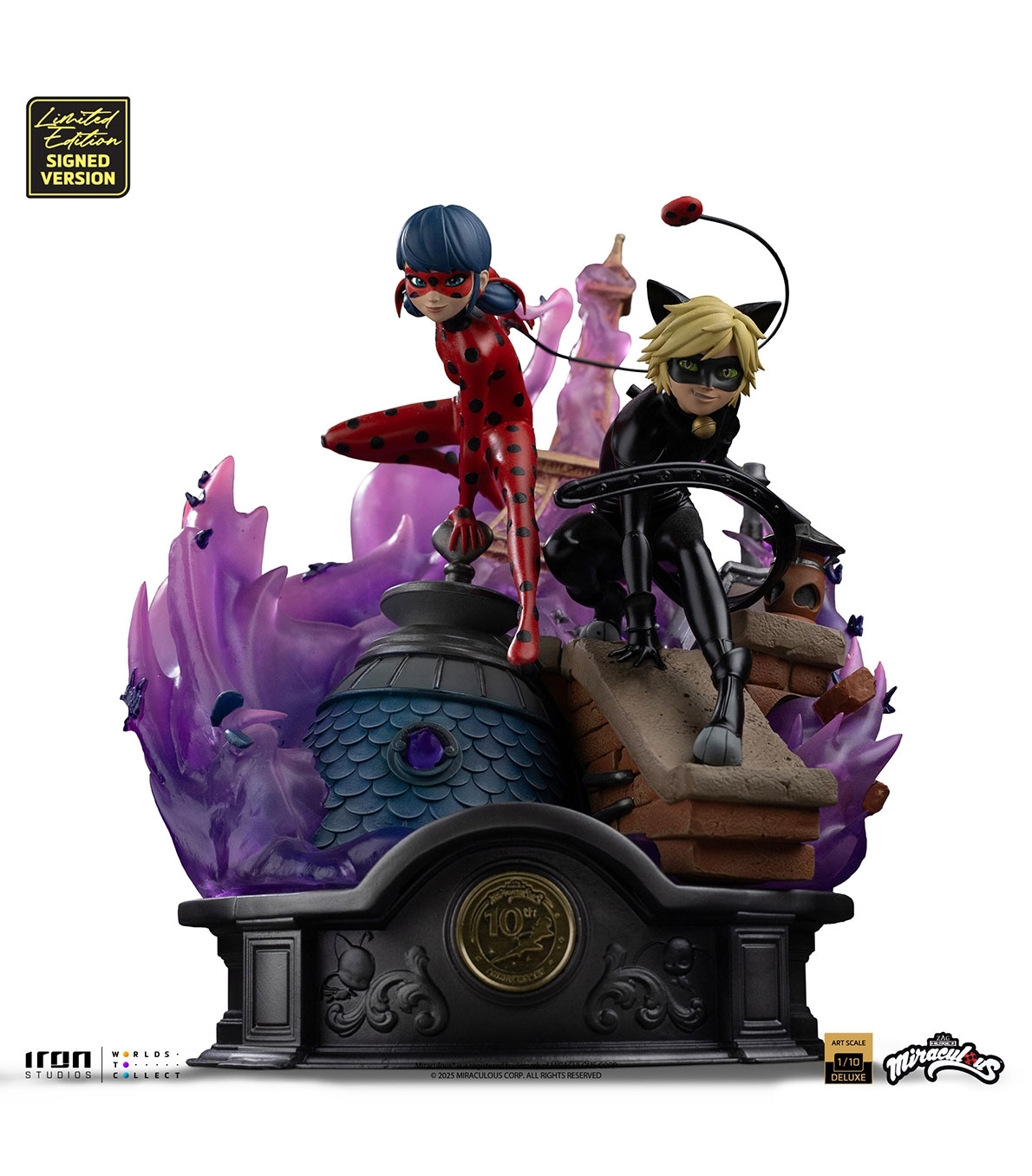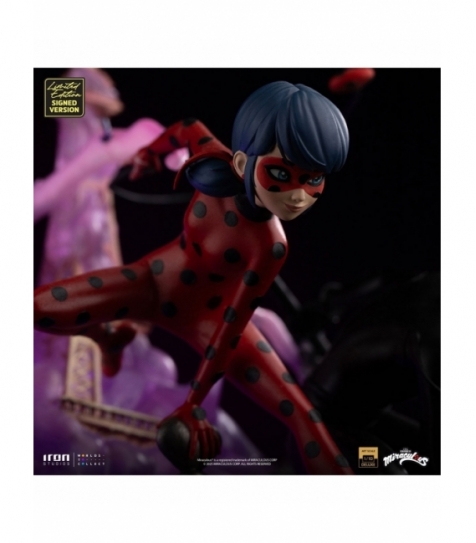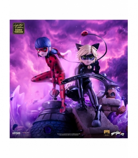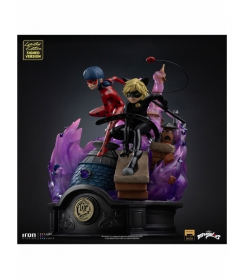 Estatua Deluxe Art Scale 1/10 de Ladybug y Cat Noir. Edición especial 10.º aniversario de la serie Miraculous. Incluye numeración individual y firma de los creadores. Fabricada en polystone con acabado pintado a mano. Ideal para venta al por mayor en tiendas de coleccionismo.
