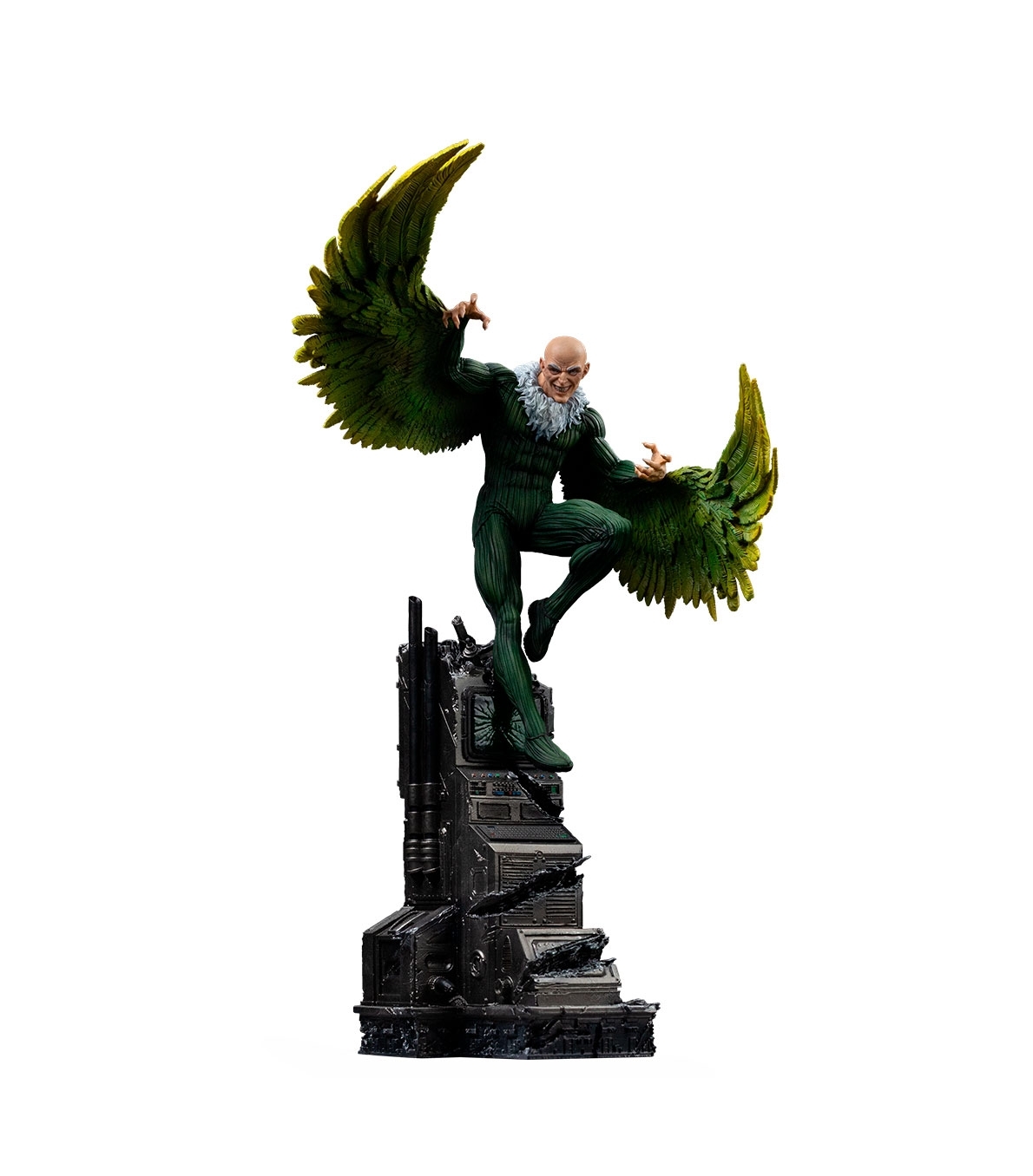 Figura de Vulture de Iron Studios, basada en uno de los villanos clásicos de Spider-Man. La estatua representa al personaje en pleno vuelo, con una composición llena de movimiento y una presencia visual muy potente. Fabricada en polystone, puede incluir piezas en resina, ABS, PVC, metal y tela. Acabado pintado a mano. Producto muy adecuado para tiendas especializadas en Marvel, cómic y coleccionismo, y para completar exposiciones temáticas de villanos.
