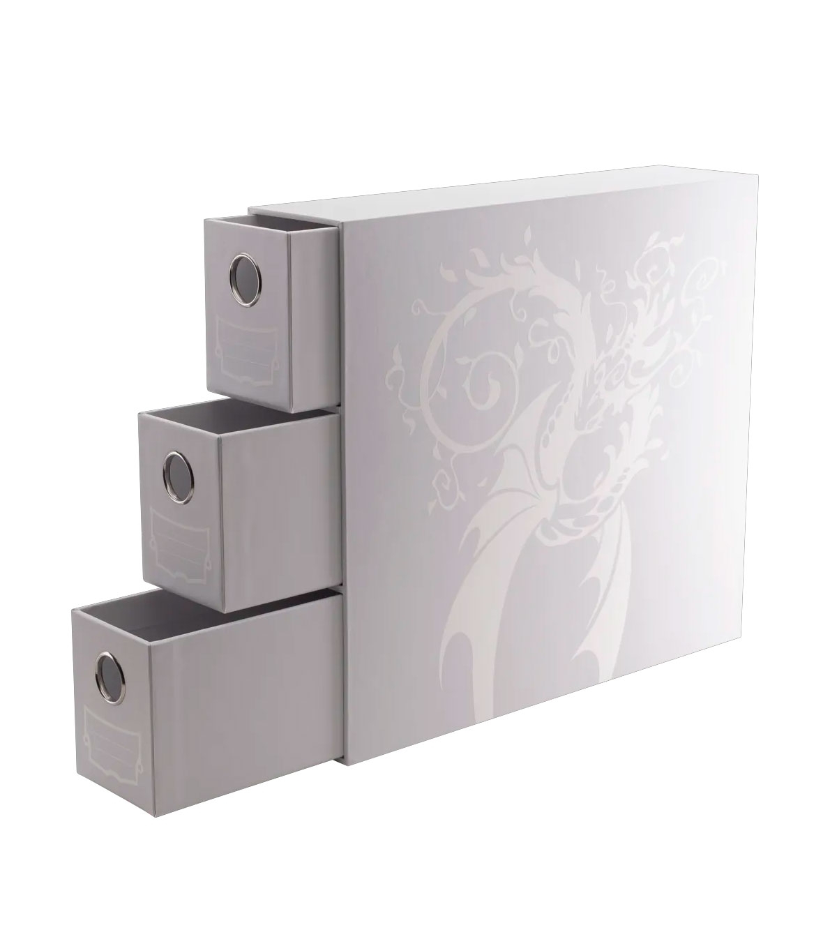 Fortress Card Drawers es una solución de almacenamiento segura, elegante y organizada para colecciones de TCG, perfecta para mantener tus cartas protegidas, ordenadas y fácilmente accesibles en la estantería. Dispone de 3 cajones con capacidad para más de 570 cartas con funda simple, 7 cajas de fundas Dragon Shield o 20 Cube Shells cada uno. Incluye separadores de espuma para fijar y organizar la colección, con posibilidad de añadir separadores adicionales. Fabricado en cartón rígido con superficie resistente a arañazos y una paleta de colores discreta que se integra fácilmente en cualquier estantería. Medidas: 86 × 319 × 363 mm; interior por cajón: 71 × 96 × 352 mm.