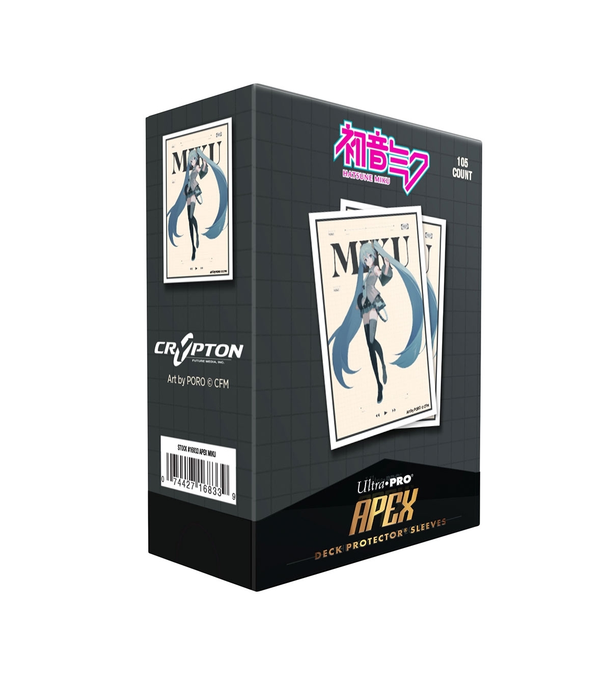 Fundas APEX Deck Protector® 105 uds. - Hatsune Miku - Tamaño estándar. Pack de 105 fundas con ilustración vibrante de Hatsune Miku en el reverso texturizado, fabricadas con nueva formulación easy-shuffle para un barajado más suave y fluido. Frente transparente brillante que realza cartas foil y materiales seguros para archivo que protegen la colección con total confianza. Compatibles con cartas tamaño estándar de 2,5 x 3,5 pulgadas. Producto ideal para tiendas y distribuidores especializados en TCG, con alta demanda entre jugadores competitivos y coleccionistas.