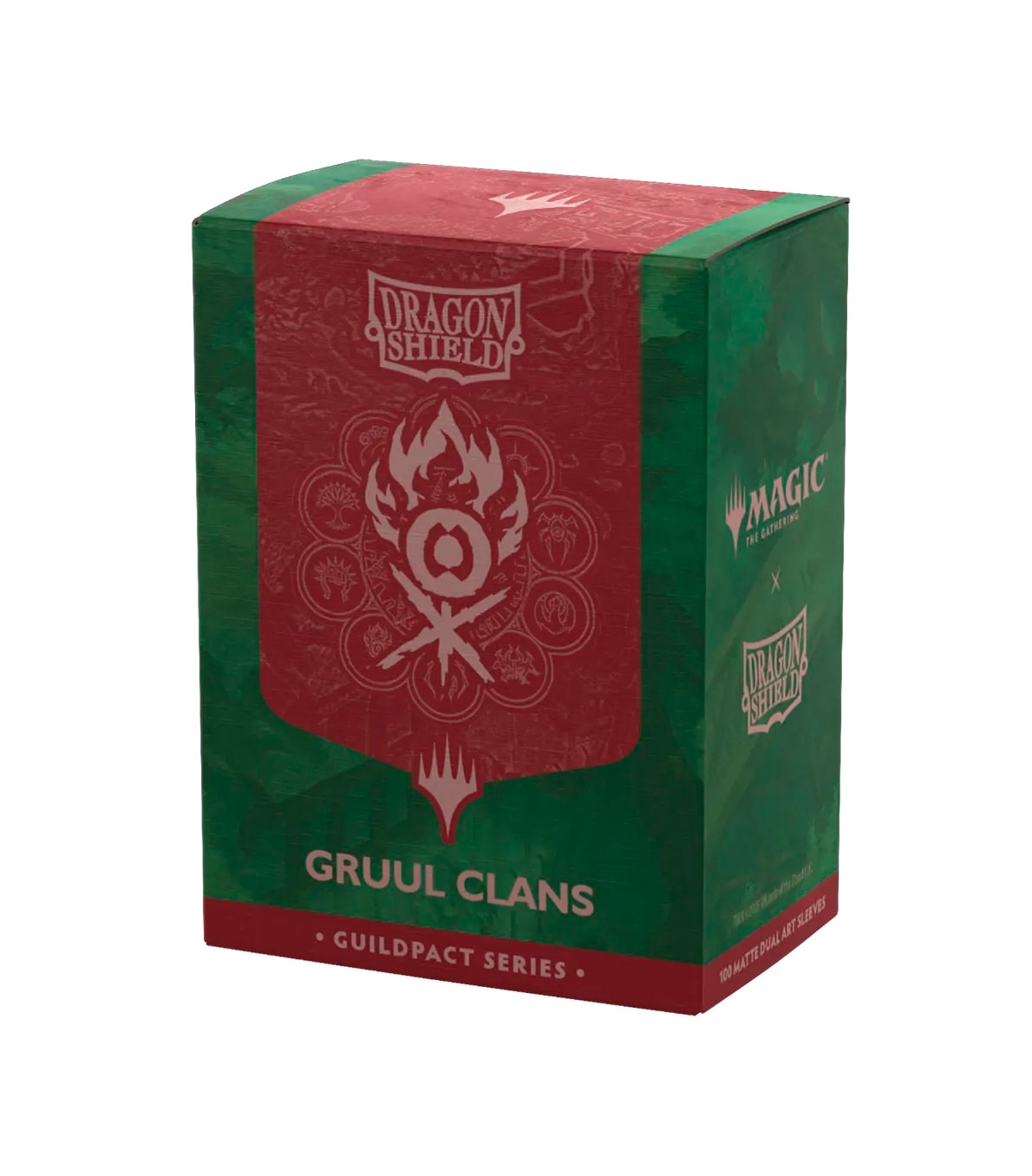 Fundas Dragon Shield Matte Dual Art Gruul Clans (100 uds.). Compatibles con cartas estándar (hasta 63×88 mm). Diseño oficial de la guild Gruul con símbolo metálico y colores temáticos. Acabado Dual Matte para una mezcla ideal de estilo y funcionalidad. Distribución mayorista en caja reutilizable.