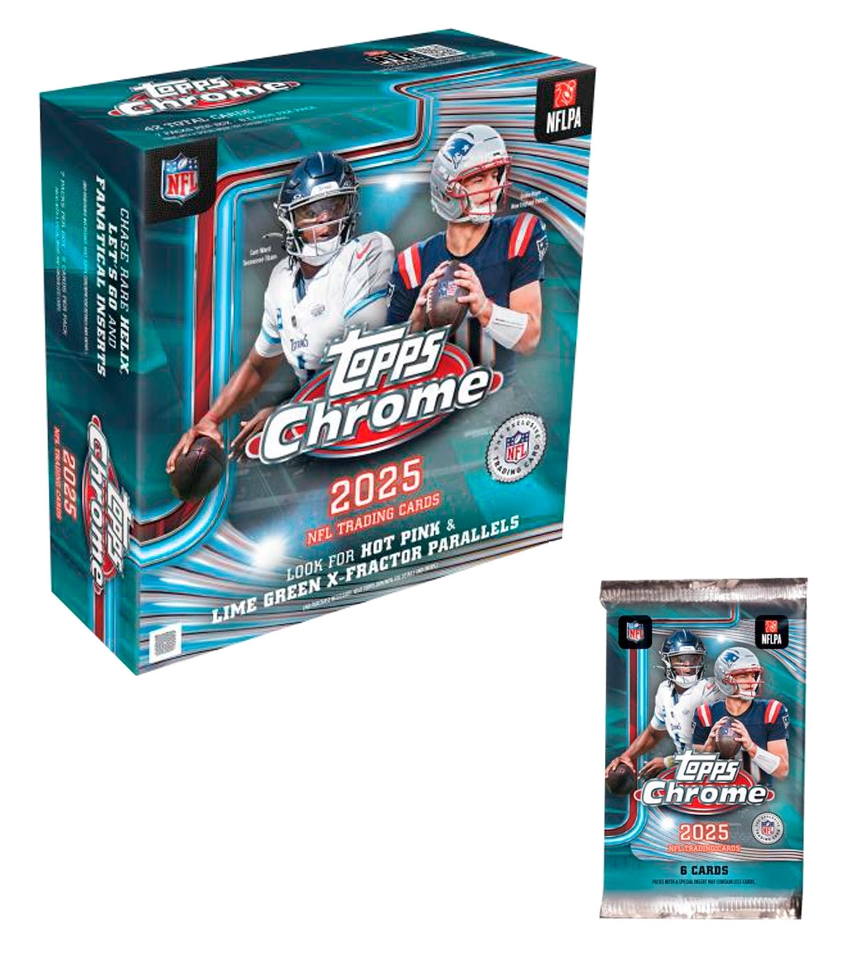 La Topps Chrome 2025 NFL Mega Box es la elección perfecta para quienes buscan una experiencia de apertura más completa, con mayor número de cartas y mejores probabilidades de encontrar paralelos llamativos.