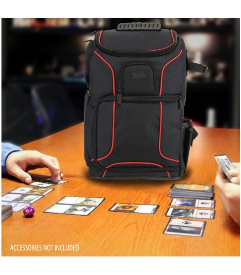 Mochila/bolsa de transporte USA Gear MTG – licenciado Magic: The Gathering – aprox. 11 × 10,5 × 6 inches. Incluye divisores de diferentes tamaños para organizar cajas hasta 400 cartas, gran compartimento con cremallera lateral para acceso rápido. Correas de hombro reforzadas, acolchado y correas ajustables de pecho y cintura para distribución de peso óptima en competición y torneos. Exterior resistente al agua para proteger cajas, dados y accesorios; bolsillo dedicado para binder/cartas. Bolsillo superior extra para bolsas de dados, fundas, boosters, tokens. Diseñada para venta al por mayor, ideal para tiendas y distribuidores de accesorios TCG.