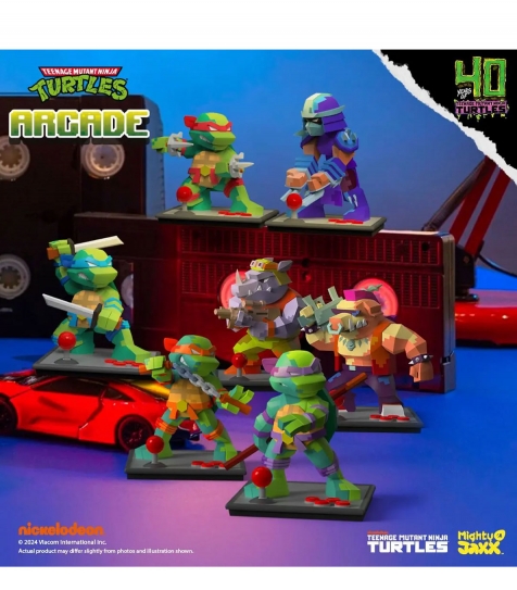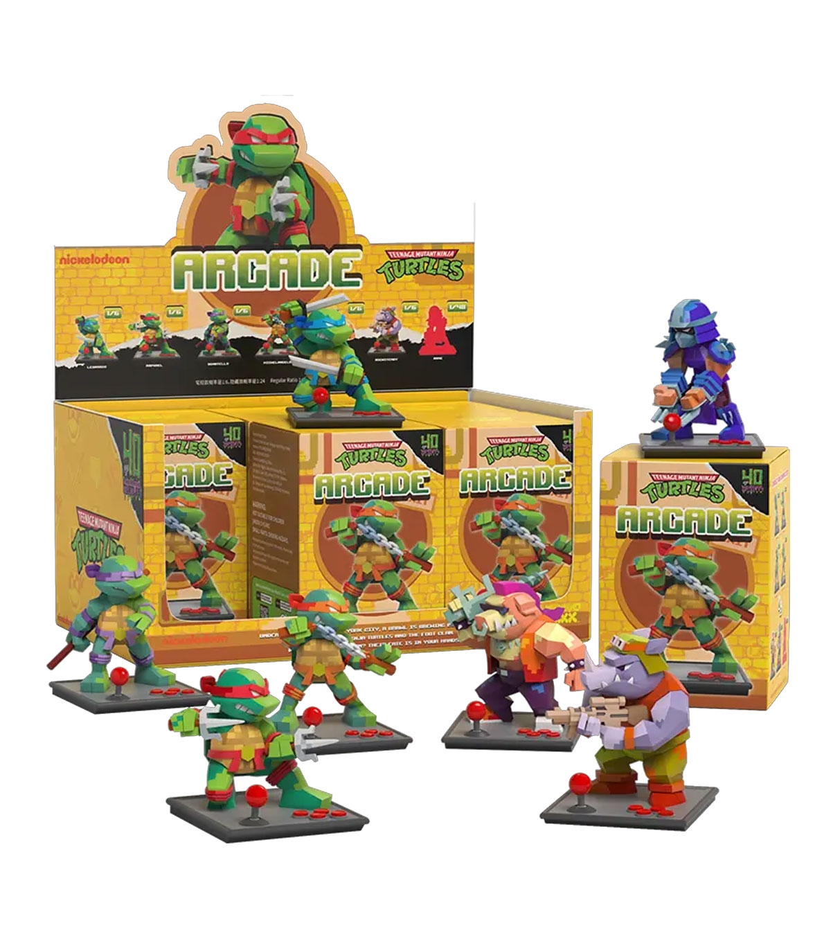 Pack de Figuras Teenage Mutant Ninja Turtles (10 cm) Tortugas Ninja - Mighty Jaxx. Figura sorpresa con diseño low-poly inspirado en los clásicos juegos arcade. Incluye base estilo arcade con 4 botones y joystick móvil. Modelos disponibles: las Tortugas Ninja, Bebop, Rocksteady y el raro Shredder. Expositor de 6 unidades sin repeticiones (figura rara no garantizada). Distribución y venta al por mayor para tiendas especializadas.