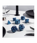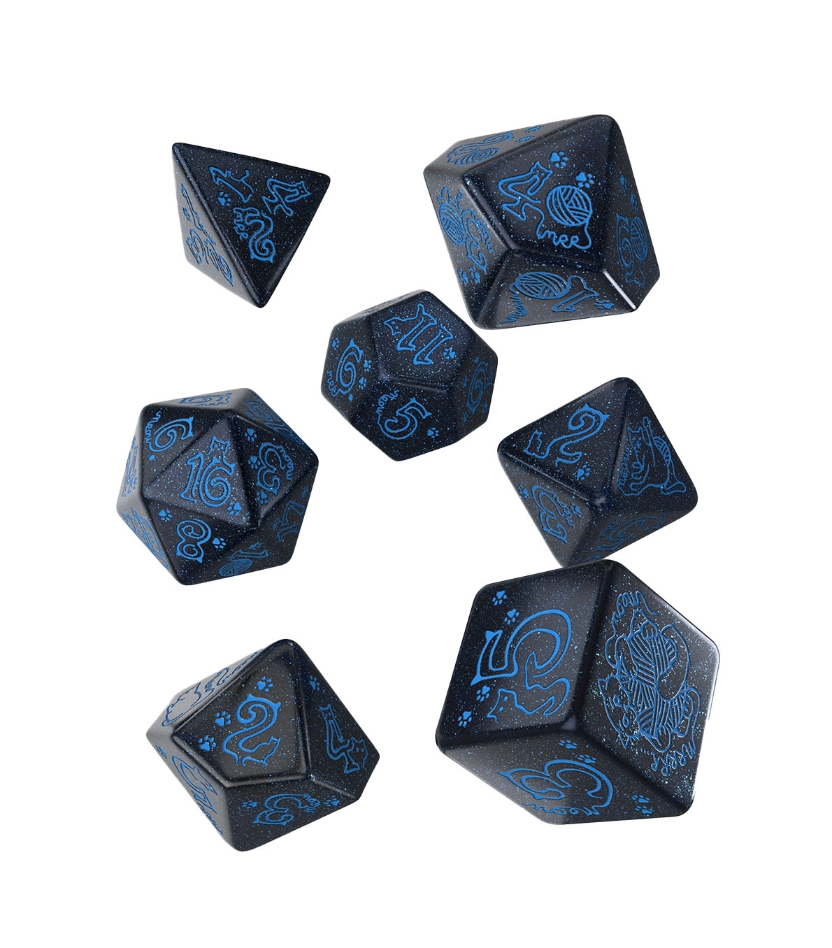 Set de dados jumbo con temática felina en azul marino y azul, tamaño superior al estándar ideal como pieza destacada en punto de venta; primera vez disponible fuera de campaña Kickstarter, dirigido a coleccionistas y jugadores; venta al por mayor para tiendas y distribuidores especializados.
