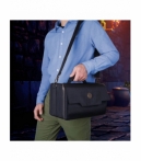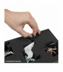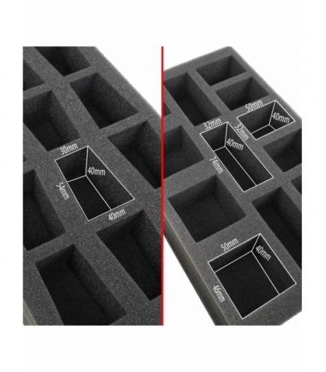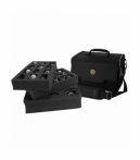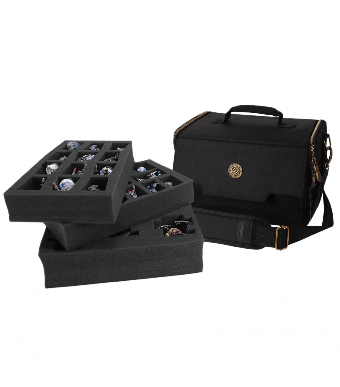 Bolsa compacta con bandejas de espuma precortadas para miniaturas de base ancha (25–40 mm). Capacidad para 25 figuras distribuidas en dos bandejas con ranuras de distintos tamaños, más bandeja personalizable para miniaturas grandes. Incluye bolsillo frontal para accesorios y correa de hombro para transporte cómodo. Fabricada con materiales resistentes, costuras reforzadas y paredes acolchadas. Dimensiones: 31,2 × 21 × 20,5 cm. Producto ideal para tiendas de rol, wargames y distribución especializada.