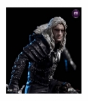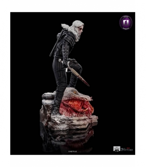 Estatua Geralt de Rivia – The Witcher – Art Scale 1/10 – Iron Studios. Figura en escala 1/10 del personaje Geralt de Rivia, basada en la serie “The Witcher”. Fabricada en polystone (resina de alta calidad), pintada a mano, con base dinámica que representa al brujo de la escuela del lobo sobre la cabeza de un basilisco. Dimensiones aproximadas: 20 × 17 × 13 cm. Distribución orientada a tiendas especializadas y venta al por mayor para ampliar catálogo de figuras de licencia televisiva y videojuego.