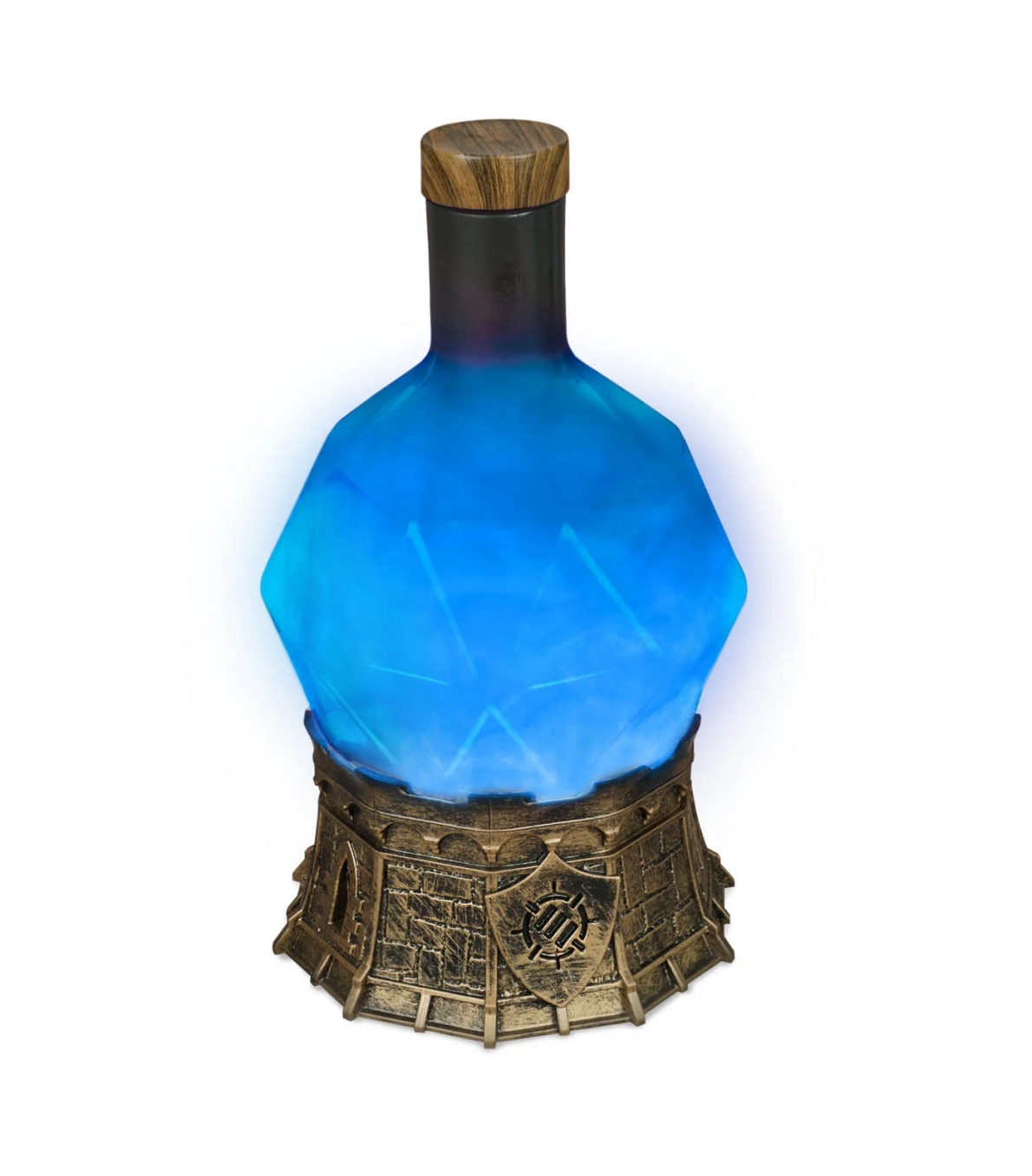 Lámpara decorativa con forma de poción mágica, ideal para ambientar partidas de rol y juegos de mesa. Efecto visual con remolino azul brillante que simula una mezcla encantada en movimiento. Funciona con 3 pilas AAA o cable USB-C (no incluidos), perfecta para colocar en cualquier entorno de juego. Diseño detallado con base de castillo medieval y botella inspirada en dado D20. Dimensiones: 21,5 × 16,5 × 16,5 cm. Producto ideal para tiendas de juegos, regalos temáticos y distribución especializada en TTRPG.