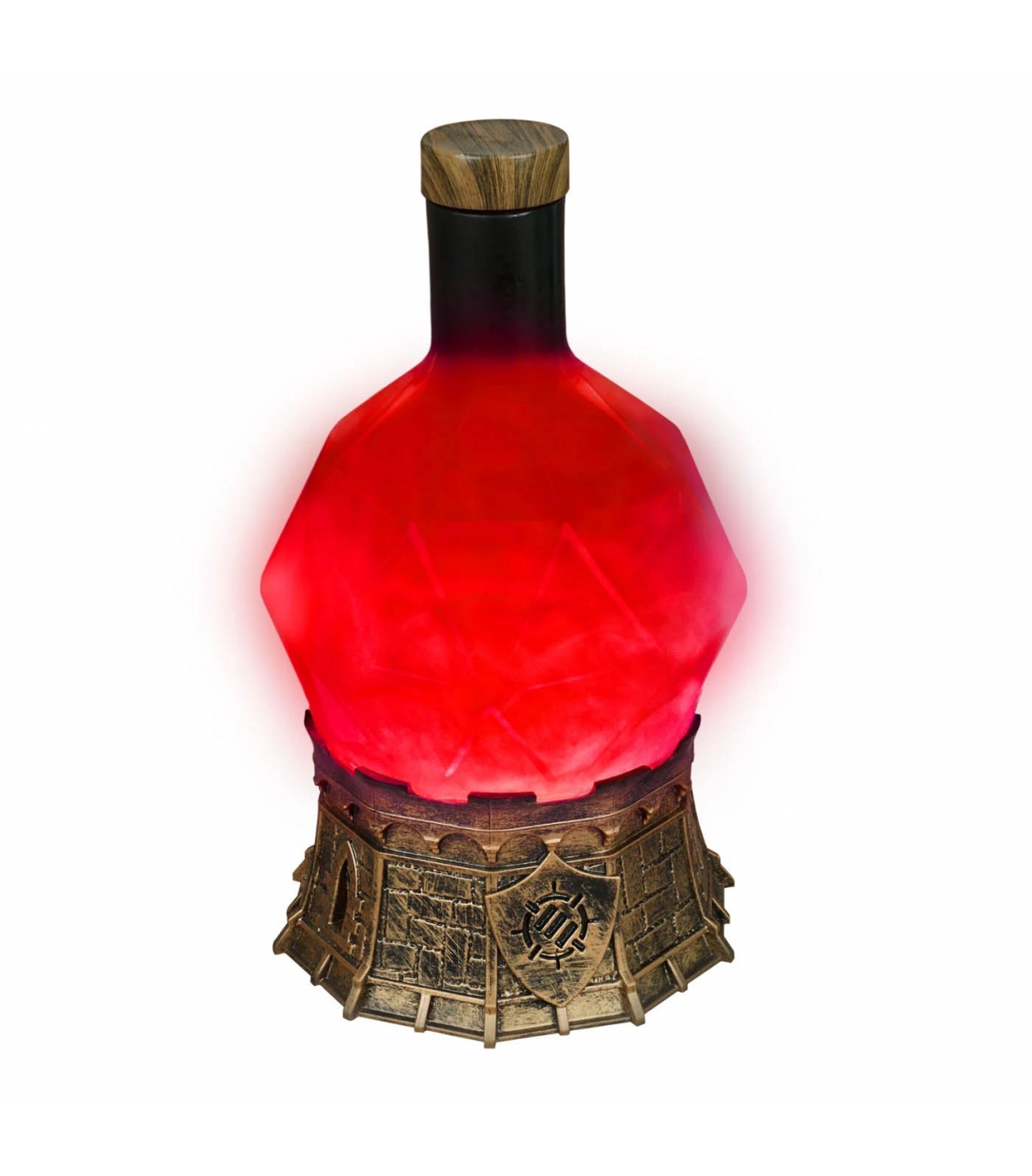 Lámpara de ambiente con forma de poción mágica, perfecta para crear atmósferas inmersivas en partidas de rol. Efecto visual de remolino rojo brillante que simula una mezcla encantada en agitación constante. Funciona con 3 pilas AAA o cable USB-C (no incluidos), ideal para transportar o decorar cualquier espacio de juego. Diseño con base de castillo medieval y botella inspirada en dado D20. Dimensiones: 21,5 × 16,5 × 16,5 cm. Producto ideal para tiendas de hobby, juegos de mesa y regalos temáticos.