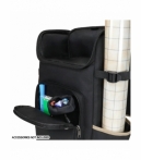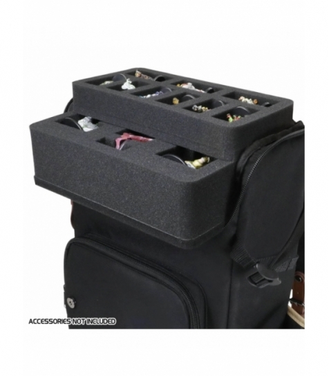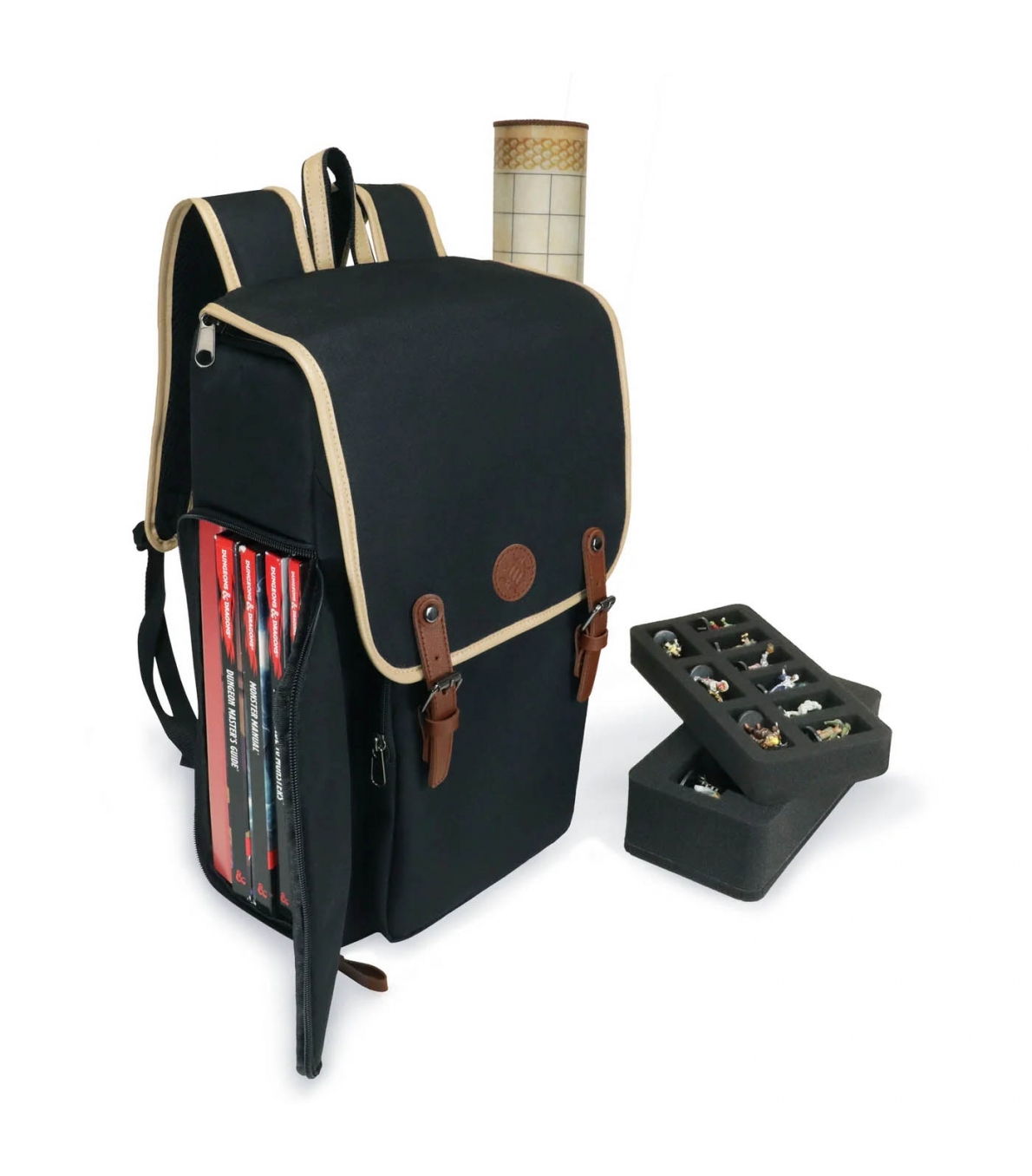 Mochila premium con acabados en polipiel y tejido resistente, diseñada para transportar todo el equipo de un director o jugador de campaña. Capacidad para 3 a 5 manuales y hasta 2 archivadores, con compartimentos tipo estantería para organización rápida. Incluye bandejas de espuma integradas para más de 18 miniaturas y una bandeja personalizable. Bolsillo frontal con cremallera para dados, fichas, lápices y accesorios. Sujeta tapetes en el lateral. Ideal para tiendas y distribuidores de productos de rol de alta gama.