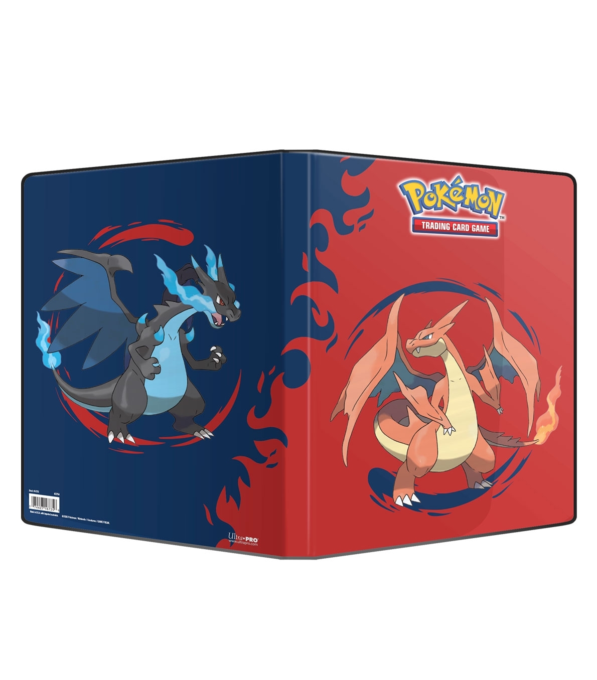 Carpeta 9‑Bolsillos Portfolio para el juego de cartas coleccionables Pokémon. Presenta una cubierta vibrante a todo color con las figuras Mega Charizard X y Mega Charizard Y. Incluye 10 páginas top‑loading de polipropileno de alta claridad, seguras para archivo y libres de ácido y PVC, compatible con cartas de tamaño estándar de 2,5 x 3,5 pulgadas. Permite almacenar hasta 180 cartas en carga doble. Fabricada en California, EE.UU. Producto orientado a distribución y venta al por mayor para tiendas especializadas.