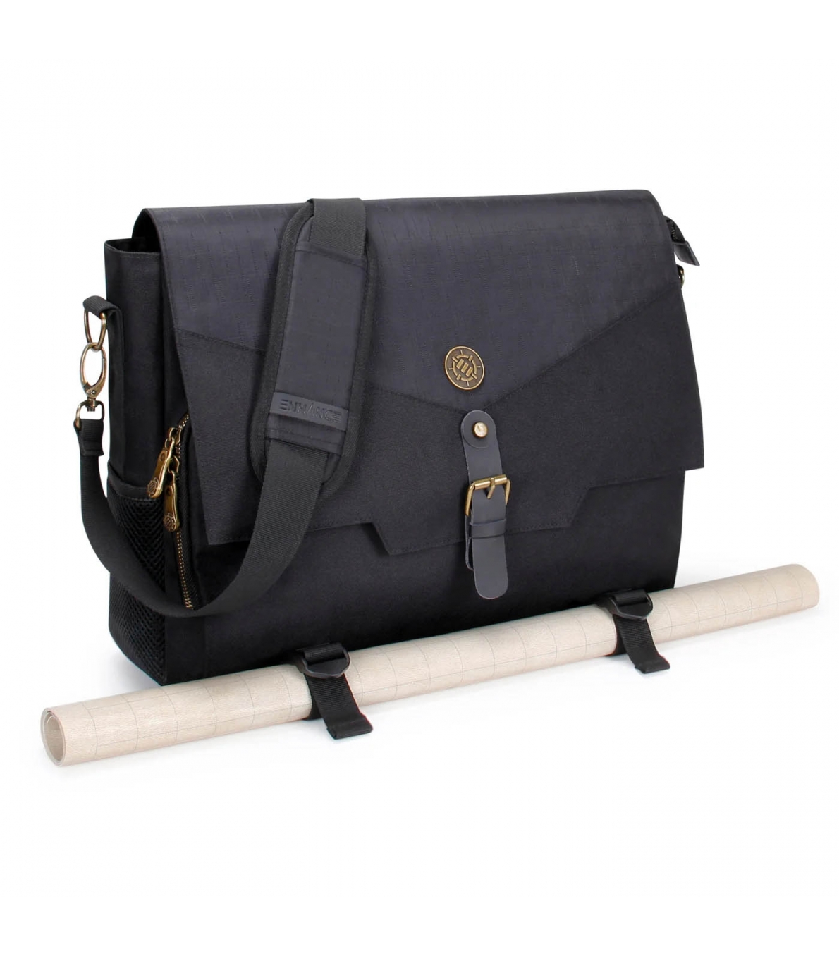 Bolsa tipo mensajero con correa, compartimento para portátil hasta 17″, bolsillos para dados, libros, mapas de batalla. Perfecta para distribución B2B de equipamiento de rol funcional.