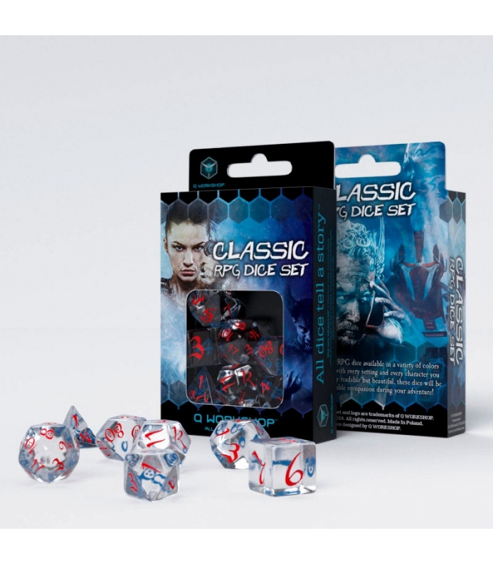 Set de Dados Classic RPG Transparente & Rojo (7 unidades) - Q Workshop. Un set de dados clásico, con diseño limpio y elegante, ideal tanto para iniciación como para partidas avanzadas. Fabricado en material translúcido con cifras en rojo intenso, ofrece gran legibilidad y atractivo visual. Perfecto para tiendas que buscan productos funcionales, versátiles y con buena rotación. Su estética cristalina transmite pureza y estilo, adaptándose a todo tipo de ambientaciones y perfiles de jugador.