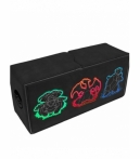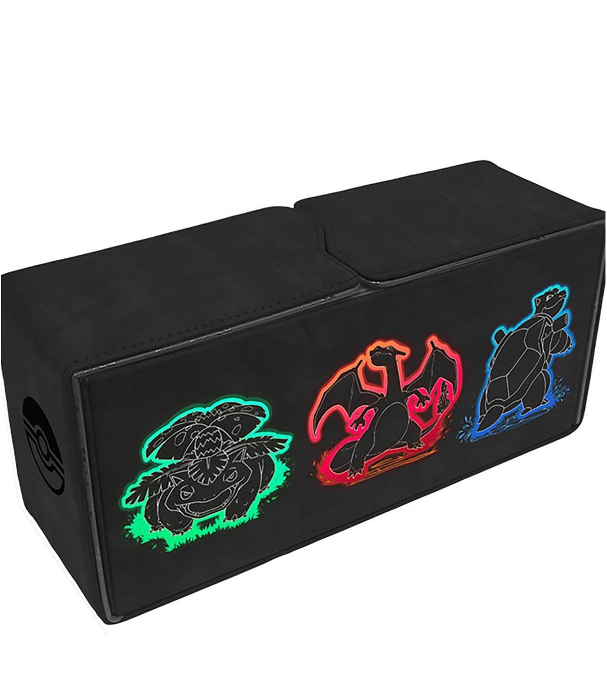 Caja Alcove® Vault Neon Kanto para JCC Pokémon. Capacidad para 3 mazos enfundados (hasta 100 cartas por compartimento). Dos compartimentos laterales y uno central para accesorios o cartas adicionales. Construcción robusta con cierre magnético y acabado en polipiel premium. Diseñada para cartas de tamaño estándar (63,5 x 88 mm). Producto orientado a distribución y venta al por mayor.