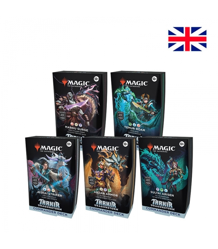 Lleva la intensidad de Magic: The Gathering a tu comunidad con este bundle exclusivo de los cinco mazos de Commander de Tarkir: Tormenta Dracónica. Cada uno representa una de las legendarias facciones del plano: Abzan, Jeskai, Sultai, Mardu y Temur, ofreciendo estilos de juego únicos. Cada mazo incluye 100 cartas (98 no foil y 2 legendarias foil tradicional sin borde), un sobre de coleccionista con 2 cartas de muestra, 10 fichas de dos caras, caja guardamazo, hoja de estrategia y tarjeta de referencia.