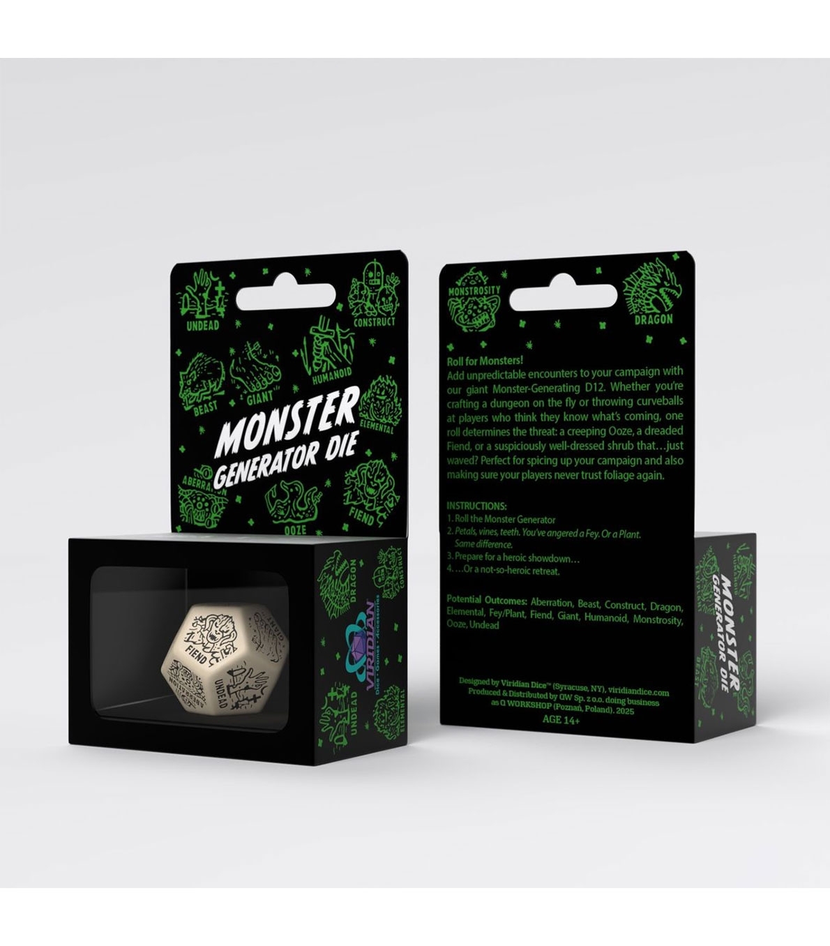 Dado “Monster Generator” – Q Workshop – Beige y Negro. Dado individual con diseño temático para generar monstruos en partidas de rol. Colores beige y negro con grabado detallado. Ideal para tiendas y distribuidores orientados al sector RPG.