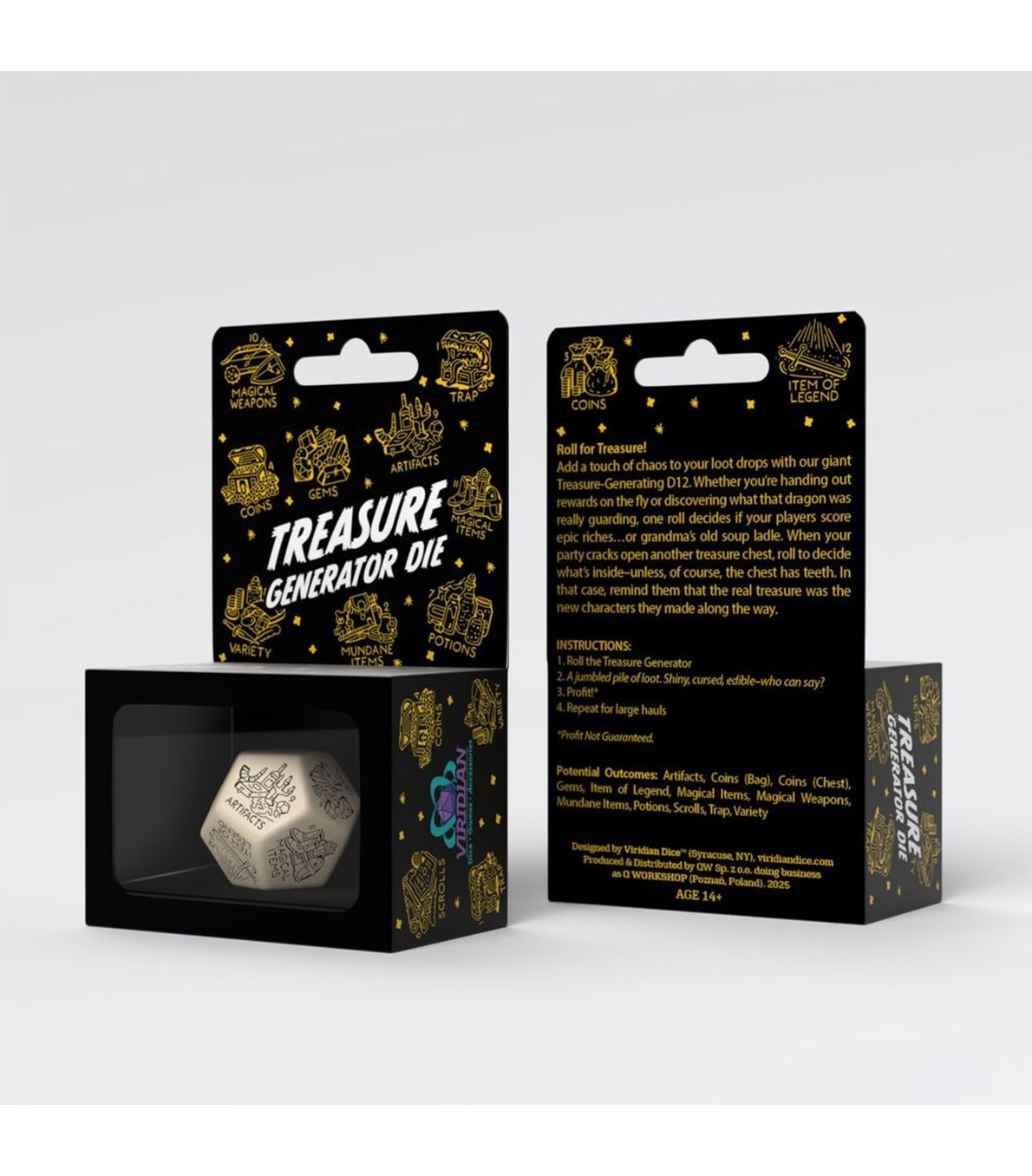 Dado “Treasure Generator” – Q Workshop – Beige y Negro. Dado individual temático para generar tesoros en partidas de rol. Diseño en colores beige y negro con detalles grabados de alta calidad. Pensado para tiendas y distribuidores en venta al por mayor