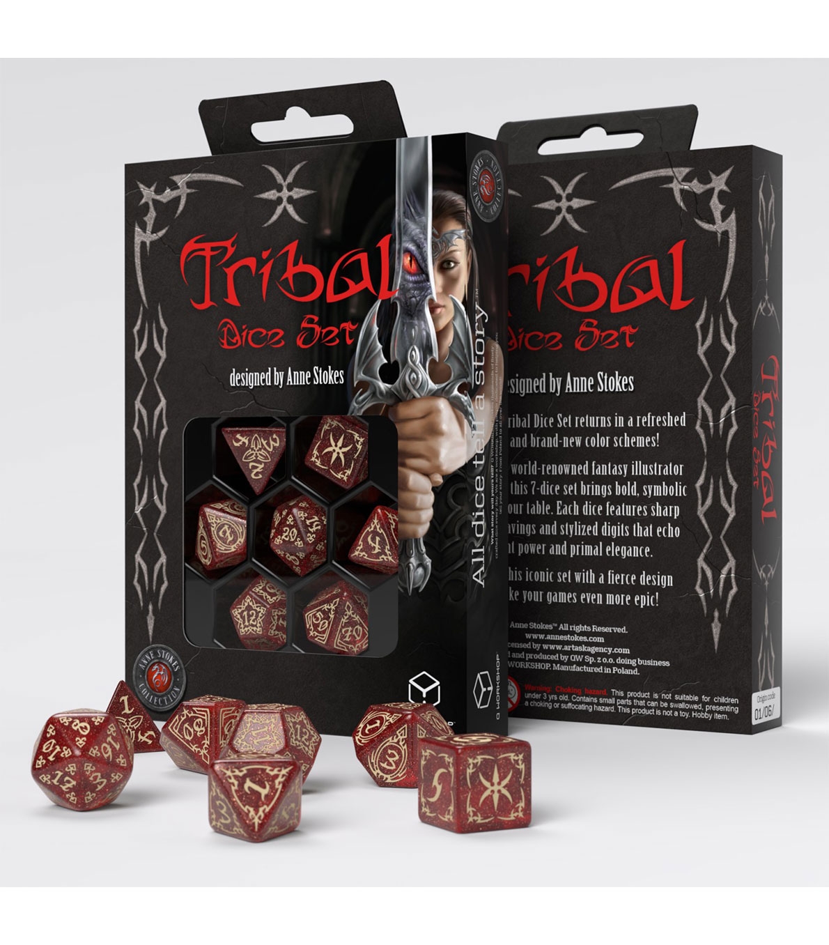Set de dados Tribal Shimmering Red & Beige – Q WORKSHOP. Diseño tribal de Anne Stokes con detalles grabados en beige sobre base roja brillante. Incluye 7 dados poliédricos: D4, D6, D8, D10, D00, D12 y D20. Acabado con polvo de purpurina que aporta un efecto centelleante. Fabricado en Europa con materiales de alta calidad. Distribución al por mayor para tiendas y comercios especializados.