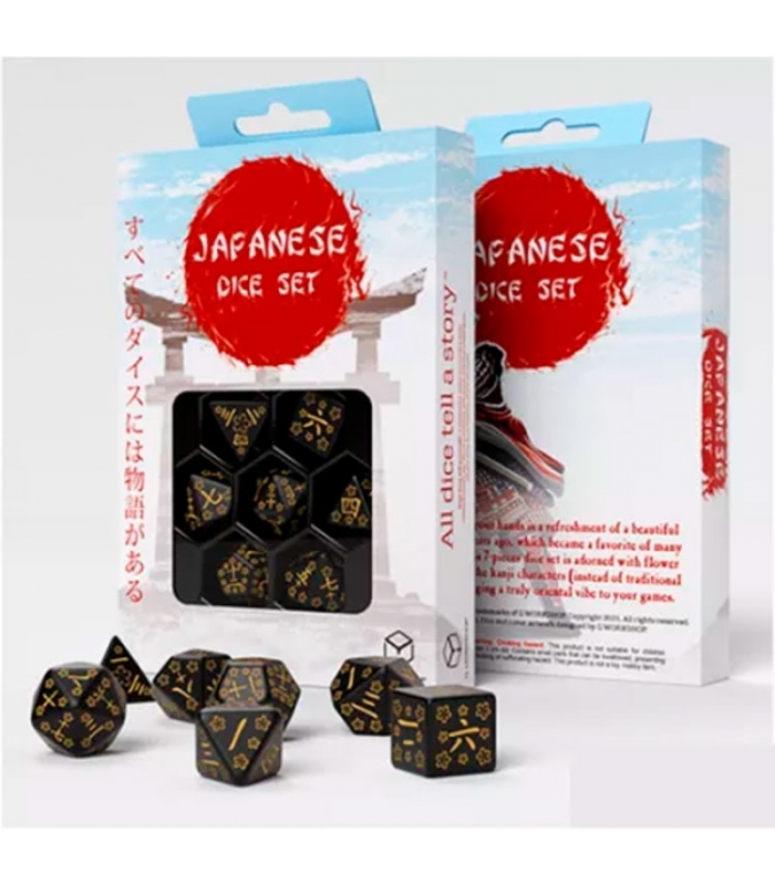 Set de Dados Japanese Negro & Oro (7 unidades) - Q Workshop. Inspirado en la estética tradicional japonesa y los valores del código Bushido, este set de dados combina elegancia y simbolismo. El contraste entre el negro profundo y el dorado representa el coraje y el honor. Grabados con caracteres kanji y detalles florales, son perfectos para partidas temáticas o coleccionismo. Una opción ideal para tiendas que buscan ofrecer productos de alta calidad con narrativa visual fuerte y gran atractivo en el punto de venta.