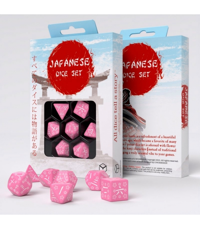 Set de Dados Japanese Rosa & Blanco (7 unidades) - Q Workshop. Un homenaje delicado a los valores del Bushido. Este set rosa con grabados blancos transmite serenidad y empatía, con caracteres kanji y detalles florales que evocan la calidez de la primavera. Fabricado con materiales resistentes y acabado duradero, combina diseño refinado y simbología cultural. Ideal para tiendas que buscan ofrecer productos con fuerte identidad visual y valor narrativo en juegos de rol o coleccionismo.