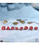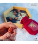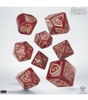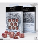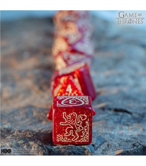 Set de dados RPG (8 uds.) - Game of Thrones - Casa Lannister. Set oficial de 8 dados inspirados en la Casa Lannister. Incluye todas las formas estándar de RPG, más dos D4. Color rojo brillante con grabados dorados. Distribución para tiendas especializadas y eventos temáticos.