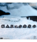 Set de dados RPG (8 uds.) - Game of Thrones - Guardia de la Noche. Set de 8 dados con símbolos de la Guardia de la Noche. Incluye dados clásicos de RPG con temática del Muro. Color negro con grabados gris claro. Producto de venta al por mayor para eventos y colecciones.