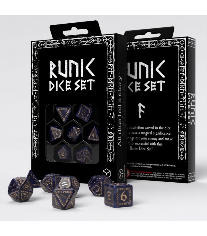 Set de Dados Runic Azul & Oro (7 unidades) - Q Workshop. Un set de dados que destaca por su elegancia mística. Fabricados en tonos azules que recuerdan a la sodalita, con grabados dorados que realzan cada símbolo rúnico, estos dados combinan estética, simbolismo y funcionalidad. Diseñados para aportar claridad, intuición y estilo a cualquier partida de rol. Una excelente elección para tiendas que apuestan por artículos visuales, versátiles y con un fuerte componente temático.