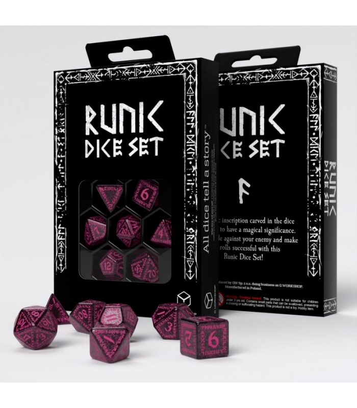 Set de Dados Runic Shimmering Negro & Magenta (7 unidades) - Q Workshop. Un set que combina estética mágica y funcionalidad. Con fondo negro brillante tipo obsidiana y grabados magenta, estos dados destacan por su fuerza visual y excelente legibilidad. Grabados con símbolos rúnicos, evocan poder, protección y misticismo. Una opción llamativa para tiendas que buscan productos con fuerte carga temática y alta rotación entre jugadores de rol, coleccionistas y fans de la fantasía oscura.