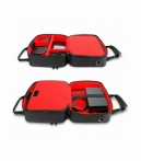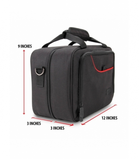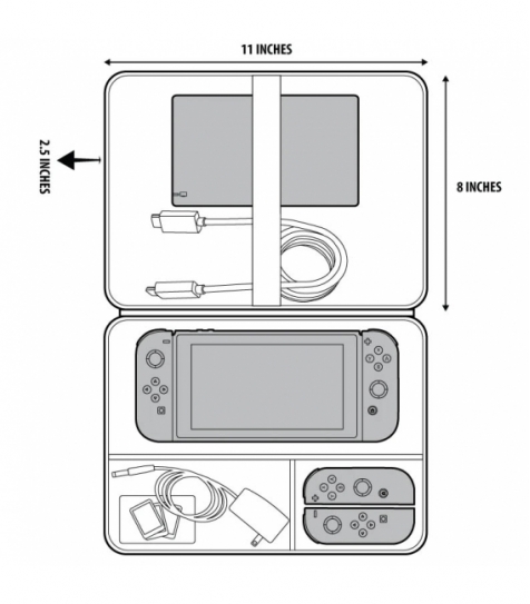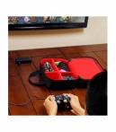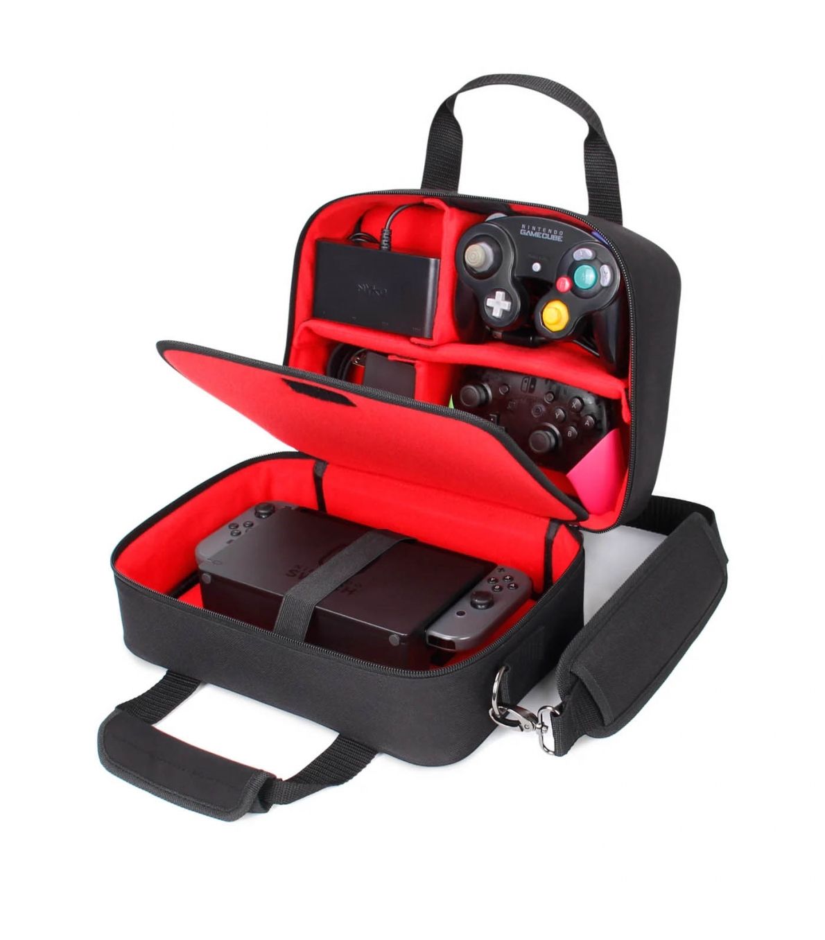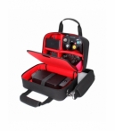 Estuche con correa de hombro, interior acolchado, varios compartimentos para consola, mandos, adaptadores. Buena alternativa de accesorio para tiendas de videojuegos y merchandising.