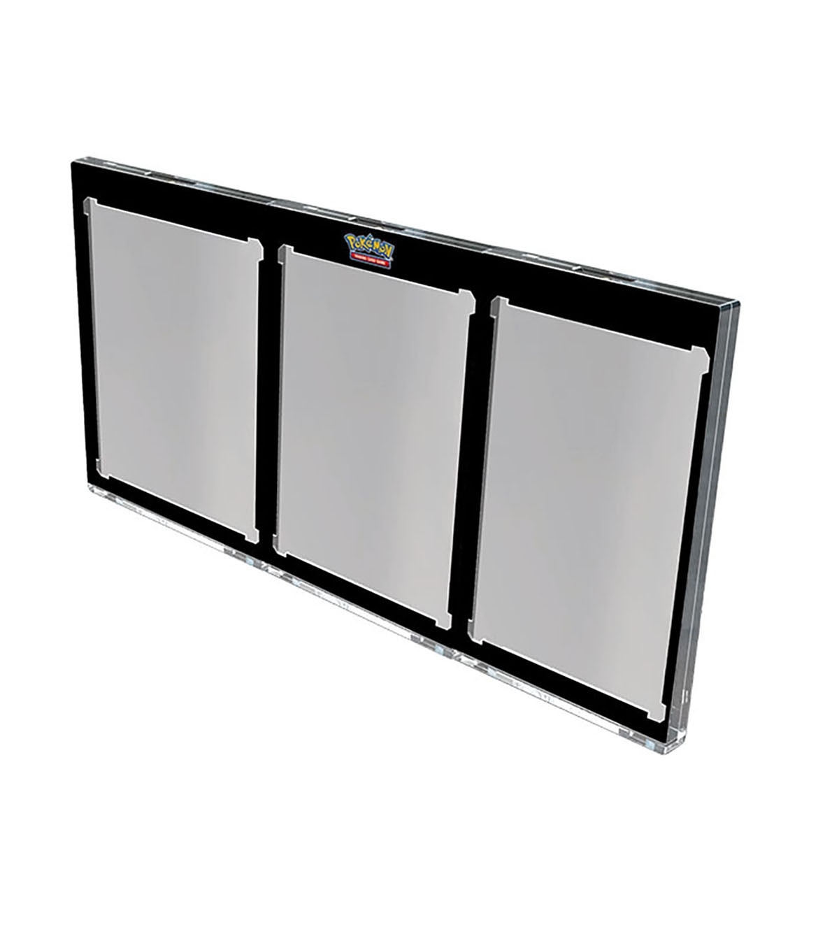 Expositor ONE-TOUCH EDGE™ 3-CARD con arte de Venusaur, Charizard y Blastoise. Diseñado para mostrar y proteger hasta 3 cartas estándar (63,5 x 88 mm, grosor máx. 35pt). Incluye bisagras deslizantes y cierre magnético, sin necesidad de herramientas. Fabricado con materiales sin PVC y aditivos UV-blocking para una conservación óptima. Producto ideal para tiendas y distribución al por mayor.