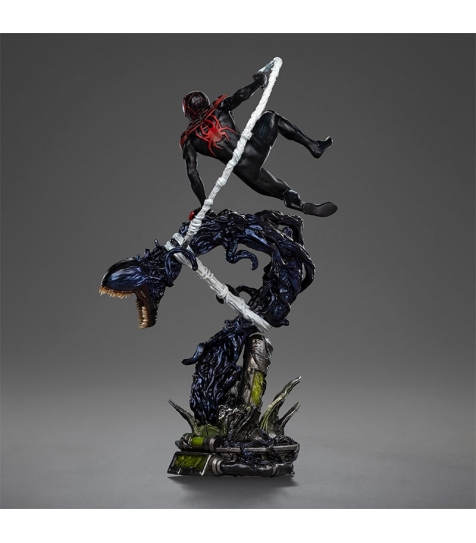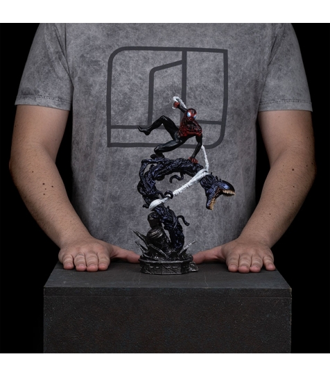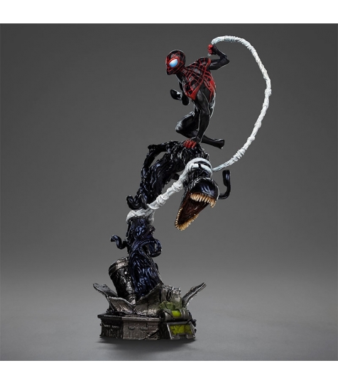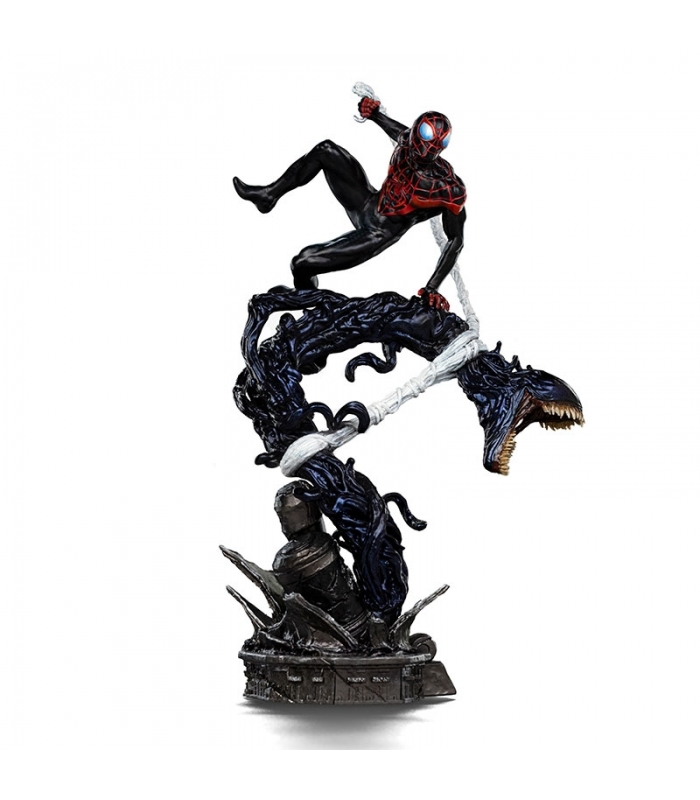 Figuras Miles Morales 32 cm de Iron Studios. Basada en la famosa licencia Spider-Man. Muñeco de gran calidad. Estatua de Miles Morales a escala 1/10, fabricada en polirresina de alta calidad y pintada a mano. Representa al héroe en una pose dinámica, enfrentándose a un enemigo con tentáculos similares a un simbionte. Forma parte del diorama "Spider-Man vs. Villains". Edición limitada, ideal para tiendas y distribuidores especializados en coleccionables de Marvel.